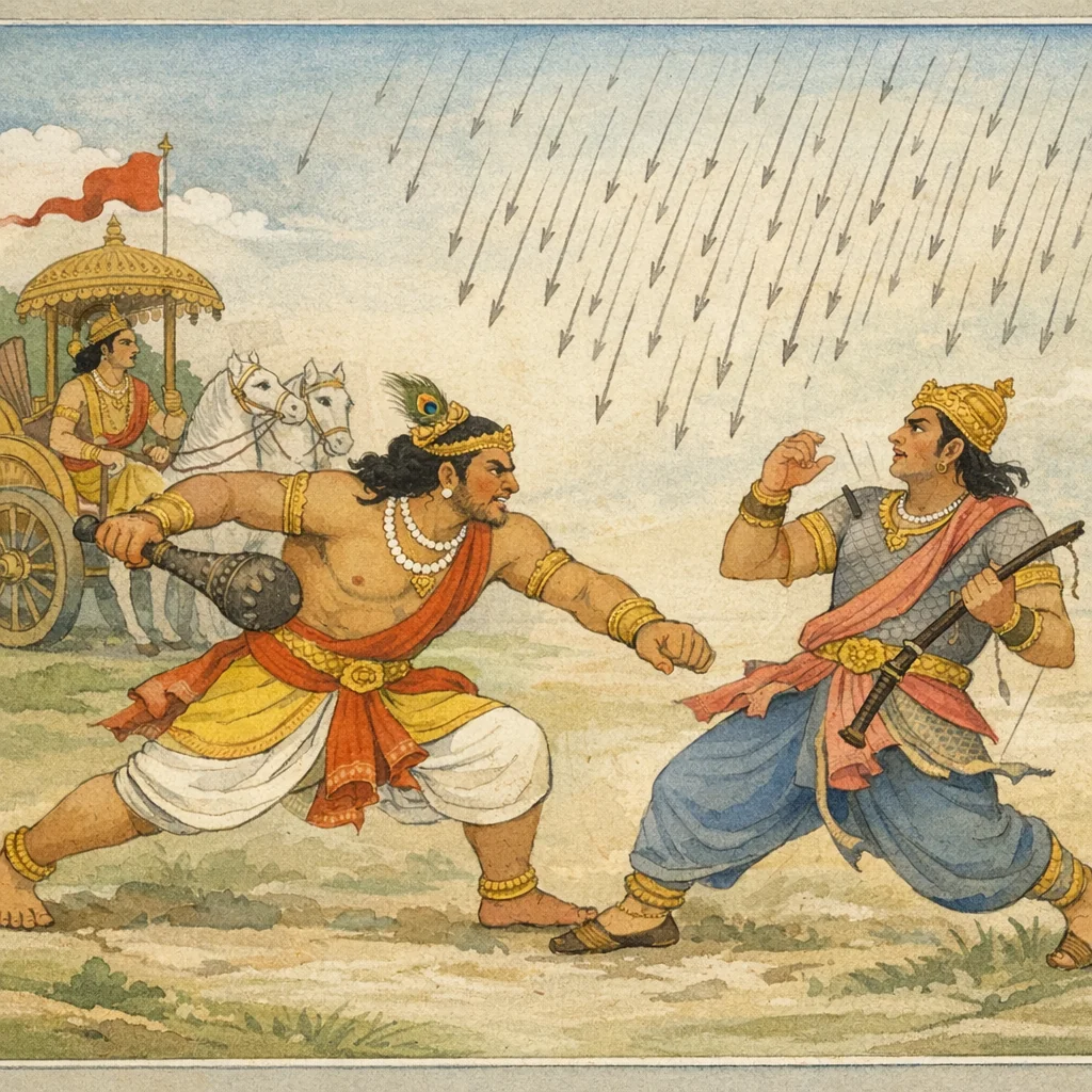 Chapter Arc: संजय धृतराष्ट्र को उस लोमहर्षक संग्राम का दृश्य सुनाते हैं जहाँ अर्जुन के रथोपान्त में भीमसेन और राधेय कर्ण आमने-सामने आ खड़े होते हैं—दोनों की कीर्ति और क्रोध एक साथ भड़क उठते हैं। → धृतराष्ट्र बार-बार पूछता है कि जिन पर उसकी पुत्र-विजय की आशा टिकी है, वह कर्ण भयंकर कर्मा भीम को कैसे रोक सका; और संजय बताता है कि कर्ण के तीक्ष्ण बाण भीम के रथ, ध्वज और सारथि तक को ढँक देते हैं, मानो शर-वृष्टि से आकाश ही गिर पड़ा हो। → भीमसेन प्रत्युत्तर में प्रचण्ड वेग से बाणों की वर्षा कर कर्ण का धनुष छिन्न कर देता है; शराहत कर्ण ‘छिन्नधन्वा’ होकर वैक्लव्य (असमर्थता/विवशता) को प्राप्त होता है और पुरुषाभिमान होते हुए भी रथान्तर की ओर हटने को बाध्य होता है। → कर्ण की यह पीछे हटना—पराजय का स्पष्ट संकेत—पाण्डव पक्ष के उत्साह को बढ़ाता है और अर्जुन के निकट भीम की उपस्थिति को युद्ध-भूमि में एक दृढ़ कवच बना देती है। → कर्ण अपमान और क्रोध के साथ पुनः अवसर खोजता है—क्या वह लौटकर भीम से प्रतिशोध लेगा, या अर्जुन-वध की अपनी प्रतिज्ञा की ओर मुड़ेगा?