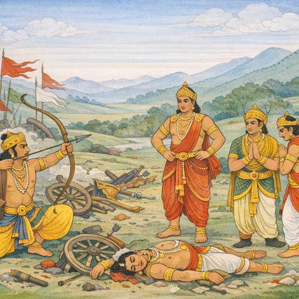 Chapter Arc: धृतराष्ट्र संजय से विस्मय और क्षोभ में पूछते हैं—जो कर्ण देव-दानव-यक्ष-मानव तक को रोक सकता है, वह युद्ध में तेजस्वी भीम/पाण्डव को रोक क्यों न सका? → संजय के वर्णन में भीमसेन अपने पुराने अपमानों और पाण्डवों पर हुए अनगिनत अत्याचारों को हृदय में धारण कर कर्ण पर टूट पड़ता है। कर्ण भी अतिरथी-गौरव के साथ प्रत्युत्तर देता है; बाण-वर्षा, शस्त्र-प्रहार और रथ-युद्ध की तीव्रता बढ़ती जाती है। दुर्योधन कर्ण को पाकर उत्साहित होता है, पर धृतराष्ट्र के मन में यह आशंका भी उठती है कि पाण्डव अजेय हैं और पुत्र दुर्योधन यह सत्य नहीं समझता। → भीमसेन कर्ण के रथ और सारथि-व्यवस्था को ध्वस्त कर उसे रथहीन कर देता है; उसी उन्मत्त क्षण में भीम के तीक्ष्ण बाण दुर्जय के मर्मस्थल भेद देते हैं और वह यमसदन को प्राप्त होता है। → दुर्जय आभूषणों से विभूषित होकर भी घायल देह से पृथ्वी पर गिरकर तड़पता है; कर्ण शोकाकुल होकर दुर्योधन की परिक्रमा करता है। भीम मुस्कराते हुए भी रथहीन कर्ण को शतघ्नी, शंकु और बाण-समूहों से घेर कर दबाव बनाए रखता है। → रथहीन कर्ण पर भीम का घेरा कसता है—क्या कर्ण इस अपमान और संकट से निकल कर पुनः युद्ध-धारा पलटेगा, या पाण्डवों का प्रहार निर्णायक बन जाएगा?