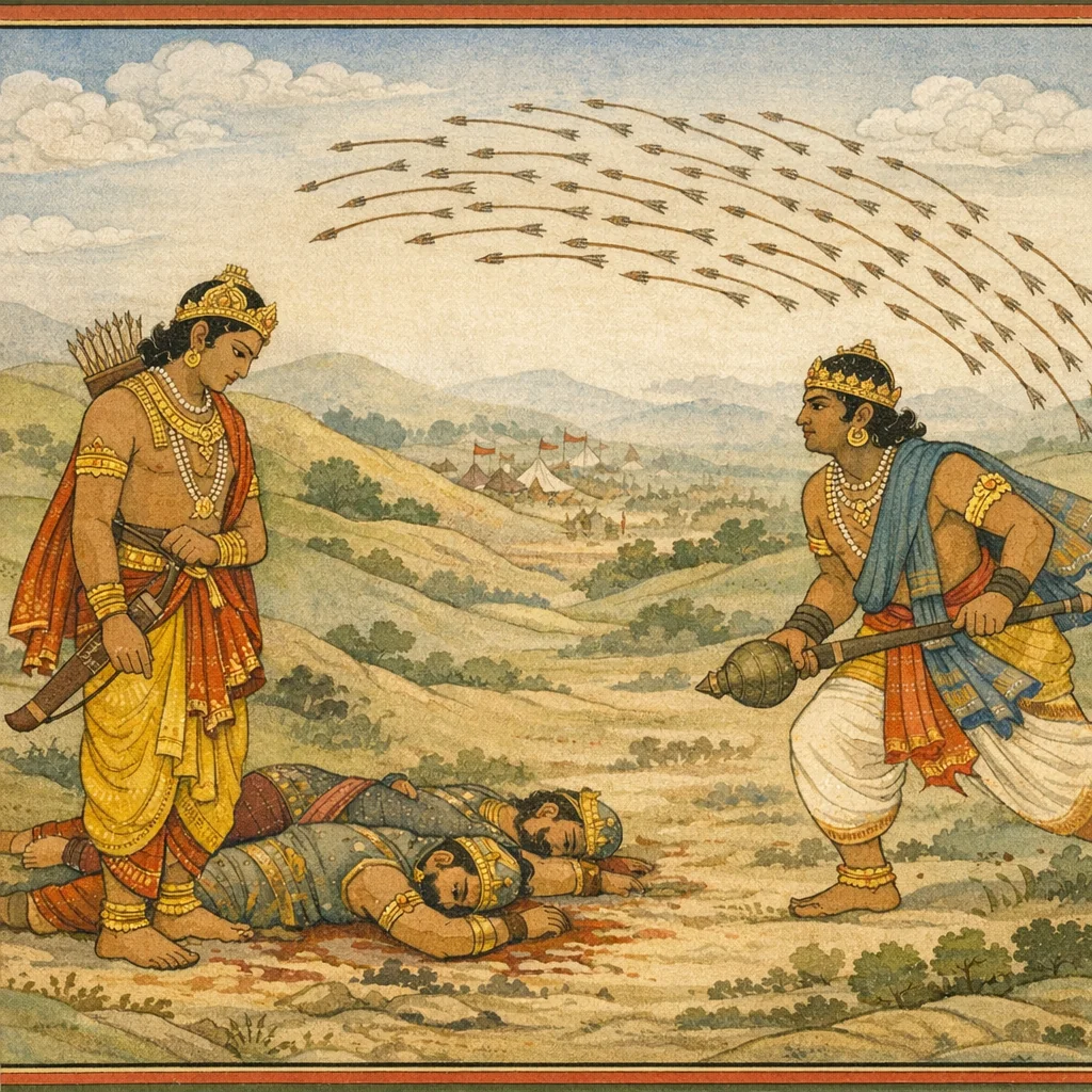 Chapter Arc: Sanjaya Dhritarashtra ko batate hain ki Bhimasena ke parakram ka samachar sunte hi Radheya Karna krodh aur pratishodh se bhar utha aur seedha Bhima ko rokne ke liye aage badha. → Karna kuch kshan Bhima ki drishti-seema se hatkar dekhta hai—Duryodhana ke putra aur bandhu Bhima ke haathon gir chuke hain. Unki dasha dekh Karna vishad se bhar kar lambi, garam saans leta hai aur phir aur bhi ugrata se Pandava-senapati Bhima par toot padta hai; dono taraf se baanon ki varsha ghan hoti jaati hai. → Karna ke dhanush se nikle morpankh-sadrish, rangin baan (बर्हिणवासस:) chaaro dishaon se Arjuna ke rath aur sainya-parivesh ko aise bedhte hain jaise pakshi vriksh ko gher lein—yuddh ka kendra ek teekhi, ghan-ghor shar-vrishti ban jaata hai aur Bhima–Karna ka sangharsh sabka dhyan kheench leta hai. → Sangharsh ke beech, yuddh ki kathorta aur kshati ka bodh ubhar aata hai—Pandava-hit mein rat mahatma (Brihaspati-sadrish buddhi wale) ke girne ka shok aur ‘yuddh nishthur hai’ ka nishkarsh bolon mein prakat hota hai; saath hi sabha-apmaan (Draupadi par Karna ke kathor vachan) ka purana paap yuddh ke phal ke roop mein yaad dilaya jaata hai. → Bhima aur Karna ka yuddh aur bhi ugr roop dharan karta hai—purane aparadh aur vartaman raktapat ek-doosre ko bhadkate hue agle kshan ko aur bhi bhayankar banate hain.