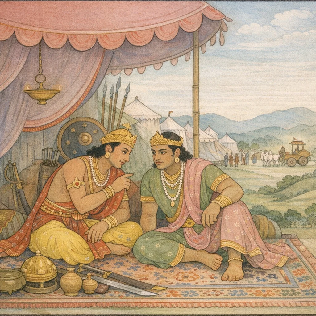 Chapter Arc: संजय धृतराष्ट्र को सुनाते हैं कि द्रोण के उकसावे के बाद दुर्योधन फिर कर्ण से मंत्रणा करता है—अर्जुन-कृष्ण की अजेय गति और आज के संकट का अर्थ क्या है? → कर्ण पाण्डवों की धावा-शक्ति का स्मरण कराता है—देवों से भी दुर्भेद्य आचार्य-रचित व्यूह को अर्जुन ने भेद दिया; जयद्रथ जीवन बचाकर लौटना चाहता था, पर ‘अनार्य’ रीति से रोका गया और द्रोण से शरण/अभय की बात उठती है। साथ ही कर्ण द्रोण की वृद्धावस्था और शीघ्र-गमन/पराक्रम की सीमाओं का संकेत देकर दुर्योधन को ‘परम यत्न’ के लिए उकसाता है। → कर्ण का तीखा निष्कर्ष—हमारी पुरुषार्थ-शक्ति को निकृष्ट उपायों/कपट-पराक्रम से काटा जा रहा है; और अब सैन्धव (जयद्रथ) युद्ध में निहत हो चुका है—यह दैव-विधान की अटलता का भी संकेत है। → कर्ण दुर्योधन को धैर्य और पुनः संगठित होकर युद्ध आरम्भ करने की सलाह देता है; दोषारोपण से अधिक, शेष सेना को समेटकर रण में टिके रहने का आग्रह करता है, और दैव तथा पुरुषार्थ—दोनों के बीच संतुलित दृष्टि रखता है। → पुनः युद्ध का आरम्भ—जयद्रथ-वध के बाद कौरव पक्ष किस प्रकार प्रतिशोध और रक्षा-रणनीति बदलेगा, और द्रोण की भूमिका आगे कैसे मुड़ेगी?