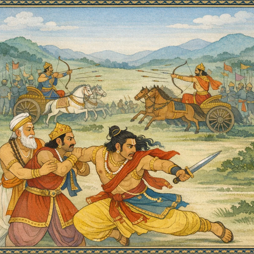 Chapter Arc: द्रोणपुत्र अश्वत्थामा क्रोध से धधकता हुआ कर्ण के वध के लिए उठ खड़ा होता है—और यह सब कुरुराज दुर्योधन की आँखों के सामने घटता है। → दुर्योधन और कृपाचार्य उसे रोकते हैं; कृप कर्ण को भी कटु वचन कहकर चेताते हैं कि उसका दर्प अंततः फाल्गुन (अर्जुन) द्वारा नष्ट होगा। इसी बीच पाण्डव-पाञ्चाल पक्ष कर्ण पर दबाव बढ़ाता है, और कौरव-सेना में भीतर-ही-भीतर नेतृत्व व अहं का संघर्ष उभर आता है। → रणभूमि में कर्ण असम्भ्रान्त होकर धनंजय के प्रतिमुख बढ़ता है; दोनों महावीर एक-दूसरे को तीक्ष्ण शर-वर्षा से ढँक देते हैं—अर्जुन कर्ण को, और कर्ण अर्जुन को—मानो दो गजराज आमने-सामने आ खड़े हों। → अश्वत्थामा का आवेग तत्काल टल जाता है, पर युद्ध का केंद्र कर्ण बनाम अर्जुन की ओर खिंच जाता है; कर्ण अपने अस्त्र-प्रहार से रथांगों और ध्वज-छत्र तक को लक्ष्य कर युद्ध को और उग्र बनाता है। → जब दोनों पक्षों के महारथी (अश्वत्थामा, कृप, शल्य आदि) अर्जुन को आते देख सक्रिय होते हैं, तब प्रश्न लटकता है—क्या यह दिन कर्ण-अर्जुन के निर्णायक परिणाम की ओर मुड़ेगा, या किसी नई रणनीति से युद्ध की धारा पलटेगी?