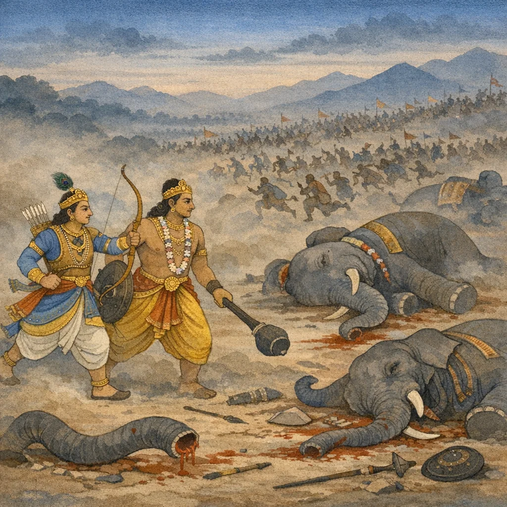 With the severed trunks of elephants and their lopped-off hands still twitching and writhing, the battlefield heaved in confusion—movement breaking out here and there amid the carnage, revealing the relentless, dehumanizing momentum of war.