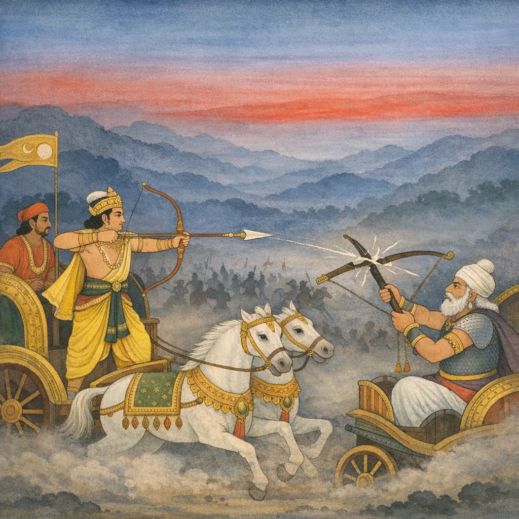 Sañjaya said: Then Pārtha (Arjuna), unshaken and full of prowess, drew his bow. Thereupon, O Bhārata, O joy of the Bharatas, he checked and blunted that missile by countering it with his own weapon. The scene underscores the warrior’s discipline: steadiness of mind and measured force—not panic—become the means by which destructive power is restrained in the midst of war.