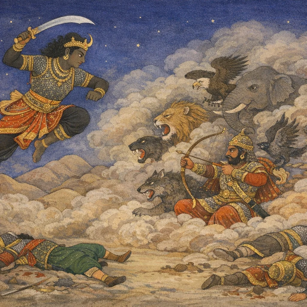 Chapter Arc: निशीथ के अंधकार में कर्ण का विक्रम पाण्डव-सेना को तितर-बितर कर देता है; संजय धृतराष्ट्र से कहता है कि कर्ण को रोकने हेतु एक महाबली राक्षस-योद्धा को आगे बढ़ाया जा रहा है। → दुर्योधन-पक्ष में यह चिंता फैलती है कि कर्ण पर घटोत्कच का धावा निर्णायक हो सकता है; उसी घोर रात्रि-युद्ध में जटासुर-पुत्र अलम्बुष क्रुद्ध होकर भीमसेन-पुत्र घटोत्कच को ललकारता है। दोनों महामायावी राक्षस अपनी-अपनी माया से हाथी-घोड़े-रथ-सेनाओं के रूप बदलते, भ्रम रचते और एक-दूसरे को घेरते हैं; पाण्डव-सेना कर्ण के प्रहारों से ‘वात-नुन्न घनों’ की भाँति बिखरती जाती है। → अलम्बुष बंधन से छूटकर पुनः वेग से घटोत्कच पर टूट पड़ता है; फिर दोनों ‘मायाशतसृज’ राक्षस-प्रवर घोर संग्राम में आमने-सामने आ जाते हैं—क्षण-क्षण में रूपांतरण, अदृश्य प्रहार, और भीषण गर्जना के बीच घटोत्कच अपनी तलवार उठाकर शत्रु पर अमित पराक्रम से निर्णायक वार करता है। → घटोत्कच के प्रचंड प्रतिघात से अलम्बुष की माया-योजना टूटती है और कौरव-पक्ष की रात्रि-रणनीति को बड़ा धक्का लगता है; फिर भी कर्ण का भय और रात्रि का अराजक प्रवाह युद्धभूमि को स्थिर नहीं होने देता। → रात्रि-युद्ध की उन्मत्त धारा में संकेत मिलता है कि कर्ण और घटोत्कच का टकराव और भी प्राणघातक रूप लेने वाला है—धर्म, नीति और अस्त्र-सीमा की रेखाएँ और धुँधली पड़ेंगी।