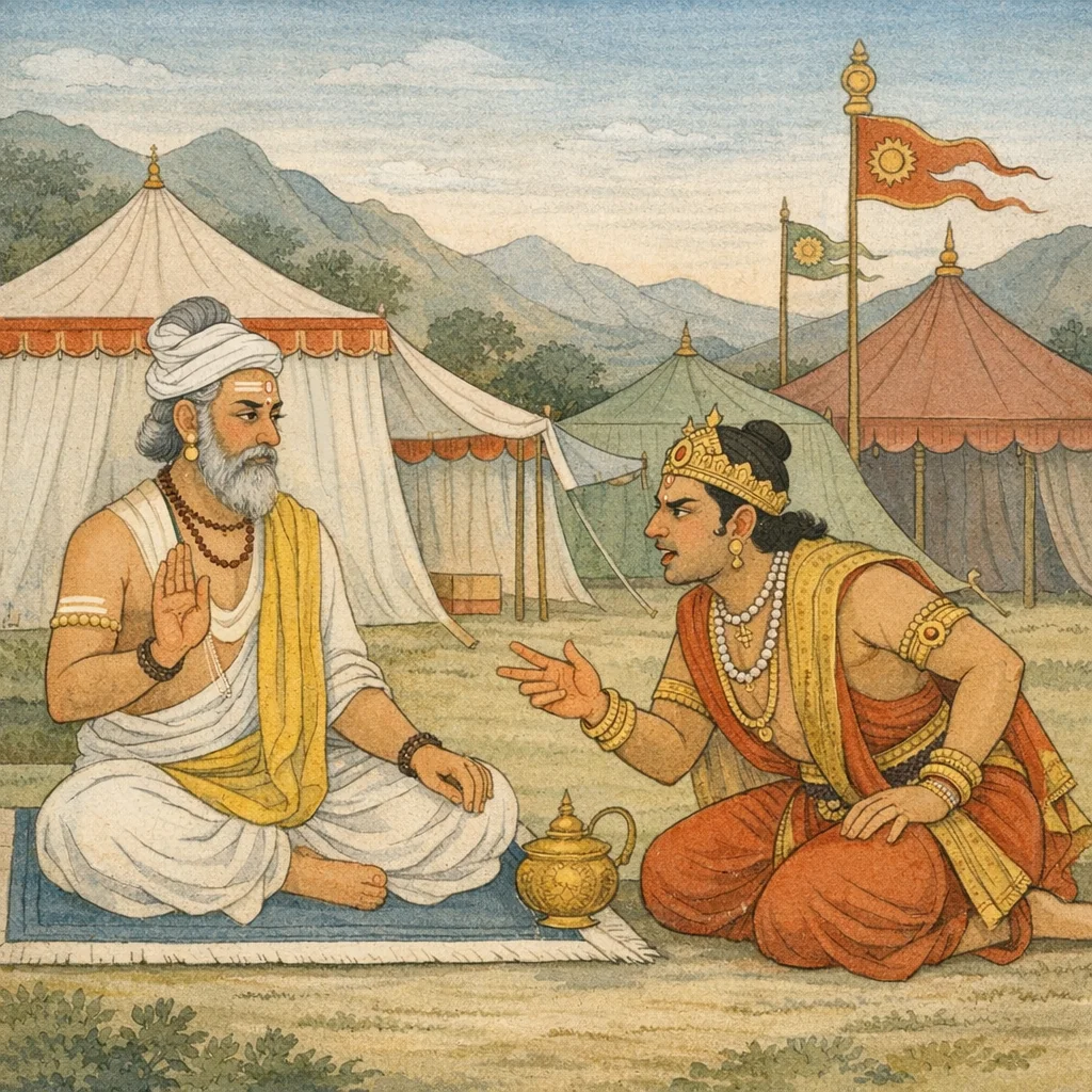 Sañjaya said: Then Duryodhana, overcome by resentment, approached Droṇācārya and spoke these words, seeking to kindle in him joy, ardor, and martial energy. In this moment, Duryodhana’s agitation reveals a leader driven by wounded pride, attempting to steer his teacher’s will through provocation and encouragement amid the moral strain of war.