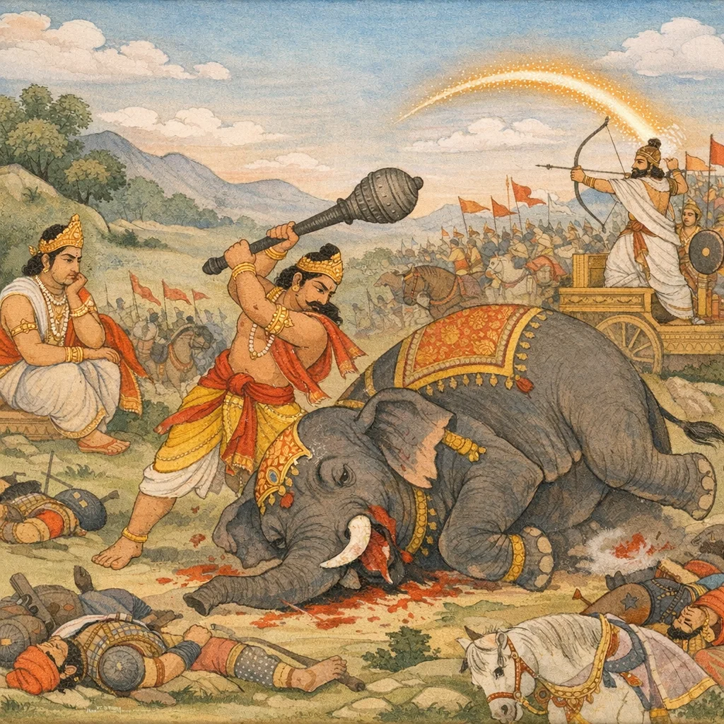 Sañjaya said: Then Bhima of mighty arms, O King, struck down with his mace a huge elephant within his own battle-array. That formidable elephant—named Aśvatthāmā—was a terrifying crusher of foes, belonging to Indravarman, the king of Mālava. The moment underscores the brutal confusion of war, where even the naming of a beast becomes morally charged, foreshadowing how truth and deception will be weaponized amid the struggle for victory.