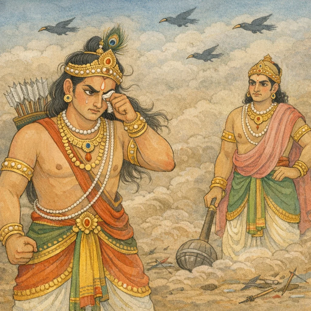 Sañjaya said: My father has gone to the realm of heroes—of this there is no doubt. Thus is death in battle framed as a passage to an honored destiny, affirming courage and duty amid the moral gravity of war.