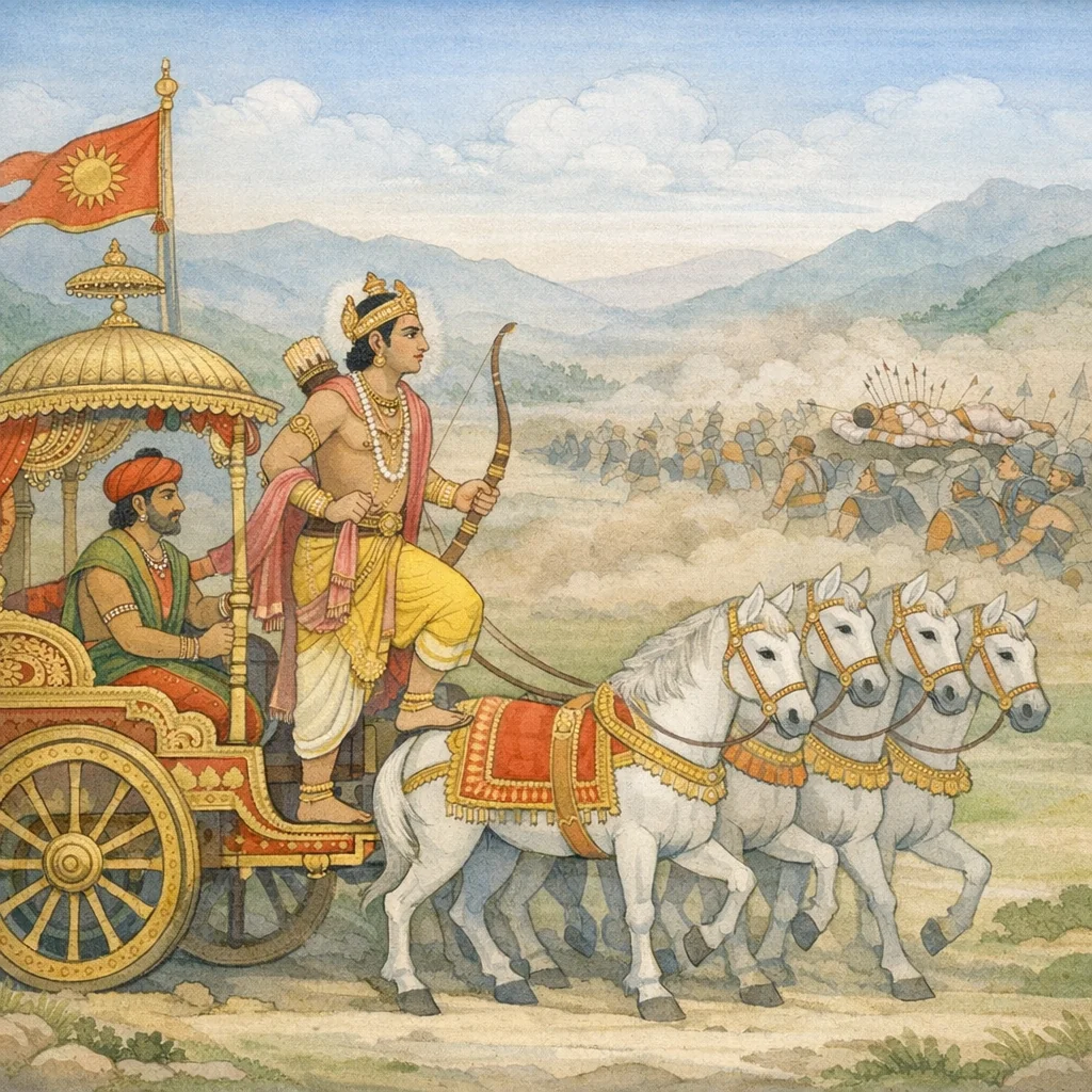Chapter Arc: भीष्म के पतन का समाचार रणभूमि में बिजली-सा गिरता है; कुरु-सेना समुद्र में डूबती नाव-सी डगमगाती दिखती है, और उसी क्षण कर्ण का तेजस्वी उदय संकेत देता है कि कथा अब नए सेनापति-युग में प्रवेश कर रही है। → भीष्म के हत होने पर कौरव-पक्ष की हताशा को कर्ण ‘पिता’ की तरह थामता है—वह शीघ्रता से आगे बढ़कर सेना को ‘संतारने’ (उबारने) का संकल्प करता है। पर सामने वह रणक्षेत्र है जहाँ यमोपम यमौ (नकुल-सहदेव), सात्यकि और स्वयं देवकीसुत कृष्ण उपस्थित हैं—ऐसा स्थल जहाँ कापुरुष टिक नहीं सकता। कर्ण अपने रथ, ध्वज, कवच-आभूषण, अश्व और मालाओं की भव्य तैयारी का आदेश देकर युद्ध-निश्चय को और तीखा करता है। → संजय के वर्णन में कर्ण का ‘अग्नि-सदृश’ रथारोहण चरम बिंदु बनता है—स्वर्ण-रत्न-माला से सुसज्जित ध्वजित रथ पर, वातजव अश्वों से युक्त, वह देव-राज के विमानस्थ-सा दीप्तिमान दिखाई देता है; भीष्म-पतन के बाद कौरव-सेना के लिए यही दृश्य नया ध्रुव-तारा बन जाता है। → कर्ण युद्ध के लिए पूर्णतः सन्नद्ध होकर जय-लक्ष्य से प्रस्थान करता है; कौरव-पक्ष की डूबती मनःस्थिति को क्षणिक स्थैर्य मिलता है—भीष्म के शून्य को कर्ण की प्रतिज्ञा और तैयारी भरने लगती है। → कर्ण का यह प्रस्थान संकेत देता है कि अब उसका सामना उन्हीं अजेय-से प्रतीत योद्धाओं से होगा जिनके बीच टिकना ‘मृत्युमुख’ में प्रवेश जैसा है—अगला अध्याय उसी टकराव की ओर बढ़ता है।