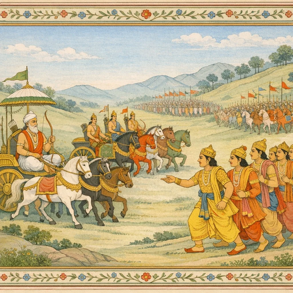 Chapter Arc: धृतराष्ट्र, युद्धभूमि की धूल और शंखनाद के बीच, संजय से पूछते हैं—जब द्रोणाचार्य ने महासमर में पाण्डवों को रोककर मोर्चा बाँधा, तब आगे क्या घटा? → वीरता का मानदण्ड उछलता है—वही सच्चा शूर है जो भग्न-सेनाओं को देखकर भी लौटकर मोर्चा सँभाले। द्रोण की अडिग व्यवस्था देखकर दोनों पक्षों में बेचैनी फैलती है; पाण्डवों की शक्ति स्वीकारते हुए भी कौरव-शिविर में यह भय उठता है कि कहीं भारद्वाजपुत्र पर असह्य भार न पड़ जाए। → सेनाके मध्य, स्वजनों से घिरे दुर्योधन कर्ण से प्रहर्षित होकर बोलता है; कर्ण का आग्रह निर्णायक बनता है—‘शीघ्र चलो, जहाँ द्रोण व्यवस्थित हैं; कहीं यतव्रती द्रोण को पाण्डव महानाग पर कूदते कोकाओं की तरह घेरकर मार न डालें।’ → कर्ण की बात सुनकर दुर्योधन भाइयों सहित द्रोण के रथ की ओर बढ़ता है। उधर पाण्डव-रथों का महान कोलाहल उठता है—एकमात्र लक्ष्य: द्रोण का वध। → द्रोण को घेरने के लिए बढ़ती पाण्डव-वाहिनी और द्रोण की रक्षा को दौड़ते दुर्योधन-कर्ण—दोनों धाराएँ टकराने ही वाली हैं।