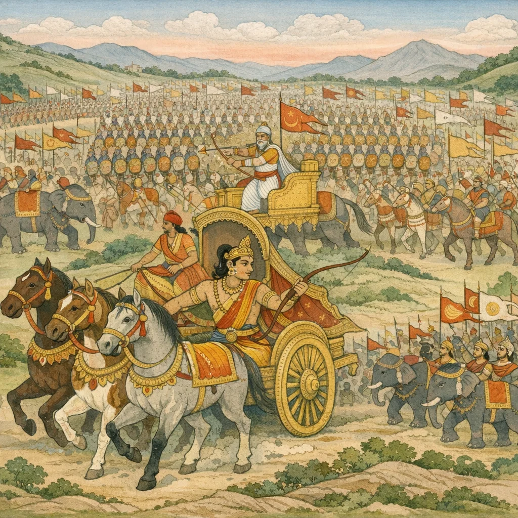 Sañjaya said: They were covered with golden fittings, and their tawny hue shone like fine silk—an image of martial splendor that heightens the grandeur of war even as it foreshadows the costly violence to come.