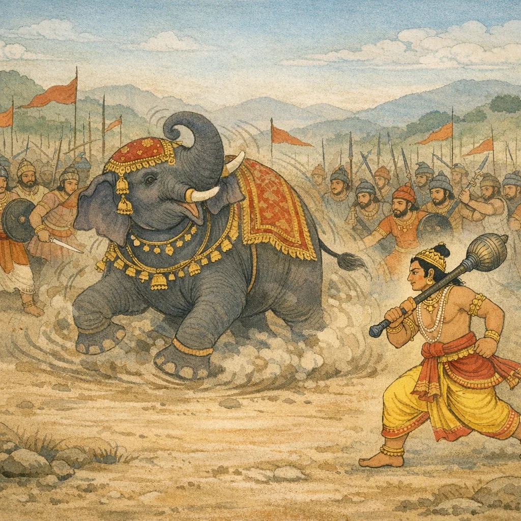 Sañjaya said: With his trunk outstretched, the elephant charged swiftly, its ears rigid and its gaze fixed. Trampling down Yuyutsu’s horses under its feet, it struck down and killed his charioteer, the sūta. In the brutal momentum of battle, strength and skill appear not as moral ideals but as instruments of war, where even a warrior’s support is made a direct target, sharpening the battlefield’s ethical harshness.