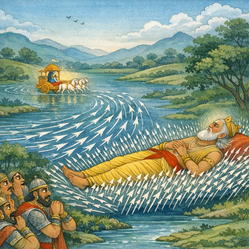 Sanjaya said: Having bowed in reverence, with his palms joined in añjali, and offering salutations, he addressed him: “I am Karna; blessings be upon you. Speak to me, O Bharata.” In the background of the battlefield, the fall of Bhishma—foremost among warriors and the crown-jewel of archers—casts the army into bewilderment. Seeing the great vow-keeper lying on his bed of arrows, Karna descends from his chariot, overwhelmed with grief and respect, and approaches with folded hands, his voice choked with tears—an ethical moment where even a fierce combatant pauses to honor seniority, vows, and martial excellence amid war’s chaos.