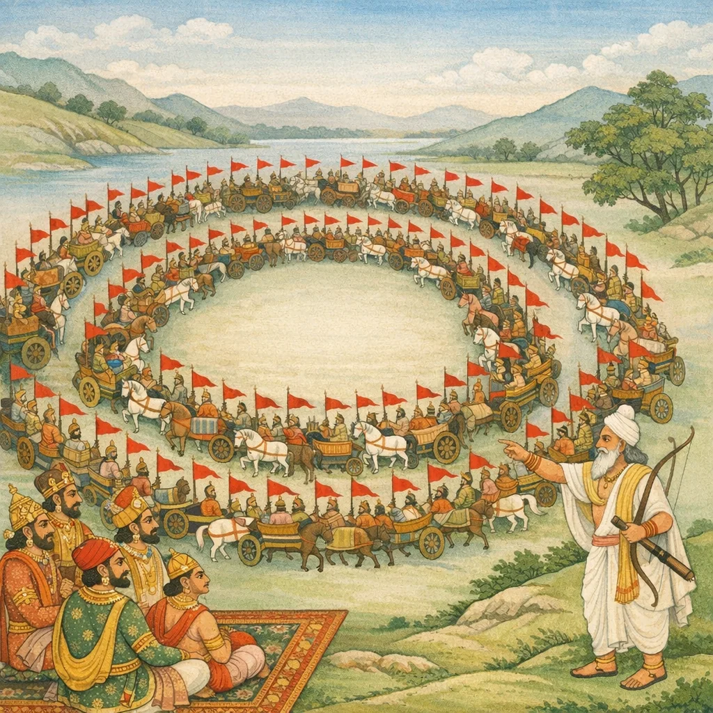 Droṇa’s Defensive Stand and Abhimanyu Commissioned to Breach the Cakravyūha (द्रोणानीक-प्रतिरोधः; सौभद्र-नियोजनम्)