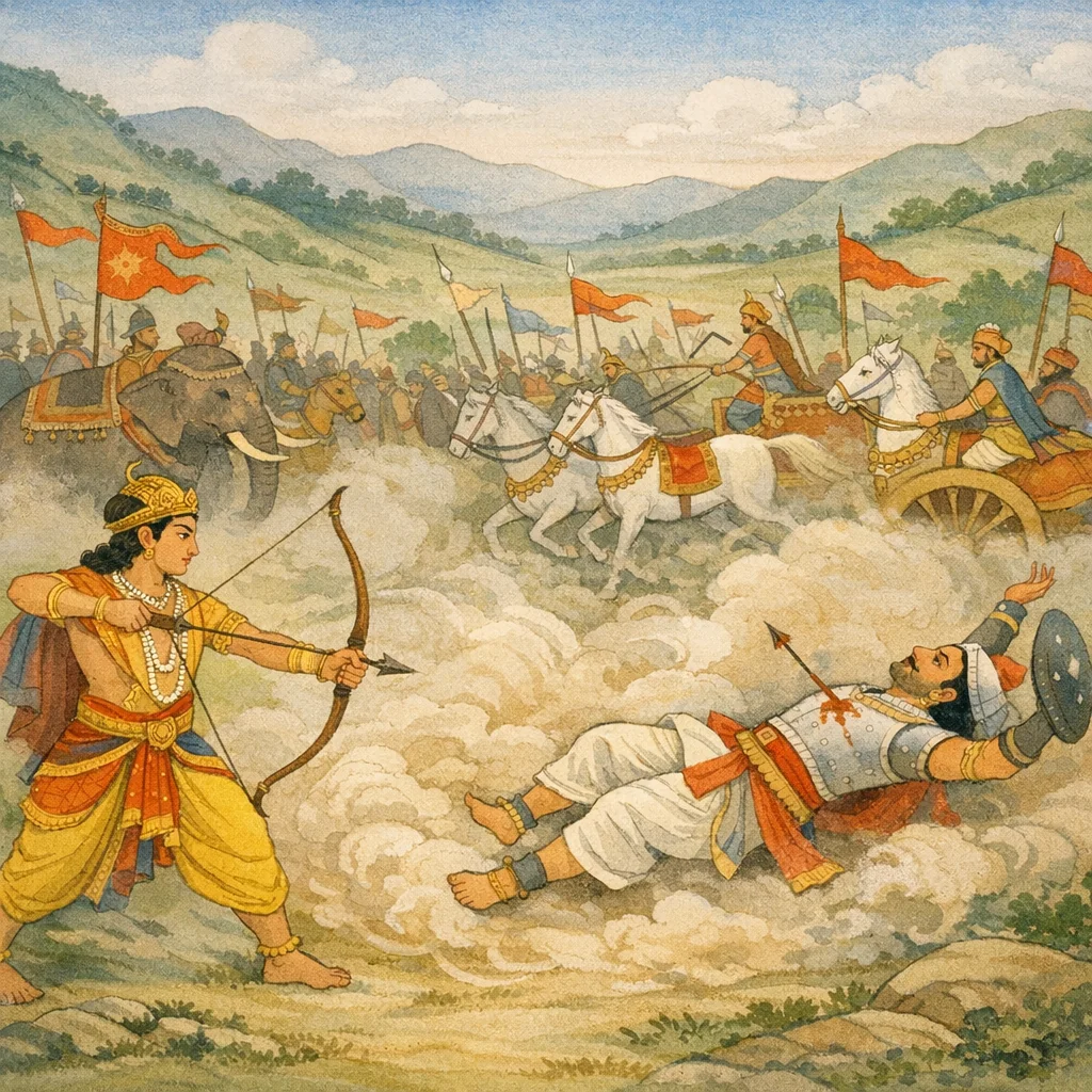 With swift, unerring strokes, Abhimanyu—Arjuna’s son—cut down every part and support of his foe: head and neck, hands and feet, bow and horses, parasol and banner, the charioteer, the triple-plumed crest, and even the chariot’s couch. Struck by that immeasurable brilliance, the warrior was shattered and fell to the earth like a great mountain broken by the force of the wind; his garments and ornaments were torn into fragments.