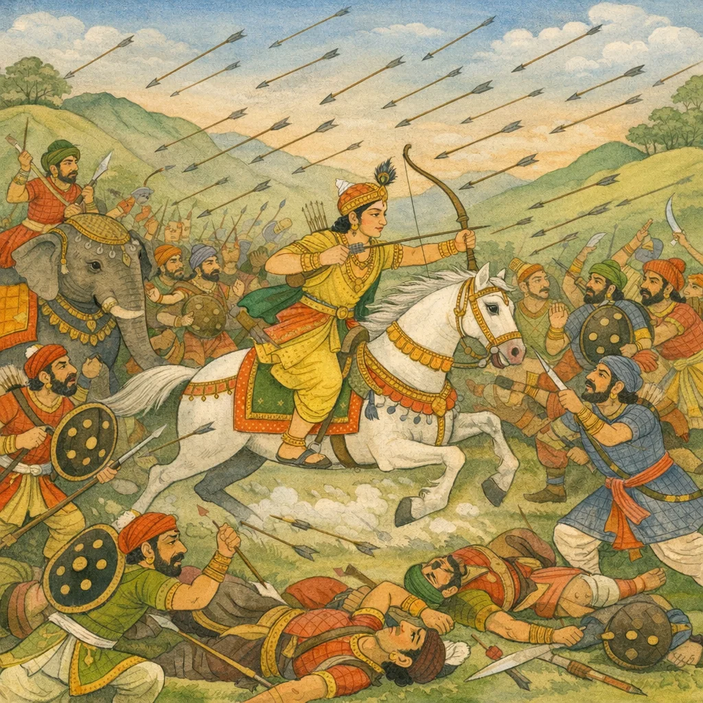 Chapter Arc: रणभूमि में सौभद्र अभिमन्यु का रथ बिजली-सा चमकता है; कौरव-पक्ष के योद्धा उसे दुर्जय जानकर भी उस पर बाण-वर्षा करते हैं—और वह मानो मुसकराकर ही चुनौती स्वीकार करता है। → कर्ण-पक्ष से तीव्र प्रहार होते हैं—अभिमन्यु के छत्र, ध्वजा, सारथि और अश्वों पर निशाना साधकर उसे असहाय करने का प्रयास; पर अभिमन्यु पितृ-पैतामह परम्परा के अनुरूप अतिमानुष कर्म दिखाता हुआ प्रत्युत्तर में आकाश को शरों से ढँक देता है। → अभिमन्यु एक ही पंखयुक्त बाण से शत्रु का शिर रथ से उड़ा देता है; उसी क्षण उसकी शर-वृष्टि से युद्धभूमि ‘धाराओं’ और ‘शलभों’ से भरे आकाश-सी आच्छादित हो जाती है और कौरव-सेना में क्षणिक अराजकता फैलती है। → शंखनाद कर अभिमन्यु कौरव-सेना में घुस पड़ता है; रथ, नाग (हाथी), अश्व और अनुजों को विदीर्ण कर भूमि को कबन्ध-समूहों से भर देता है—और सेना-मध्य में वासव-तुल्य तेज से विराजमान होता है। → अभिमन्यु का यह उन्मत्त पराक्रम कौरवों को उसे घेरने और नियम-भंग की ओर धकेलता है—अगले प्रसंग में उसके विरुद्ध संगठित चक्रव्यूह-घात की छाया गहराती है।