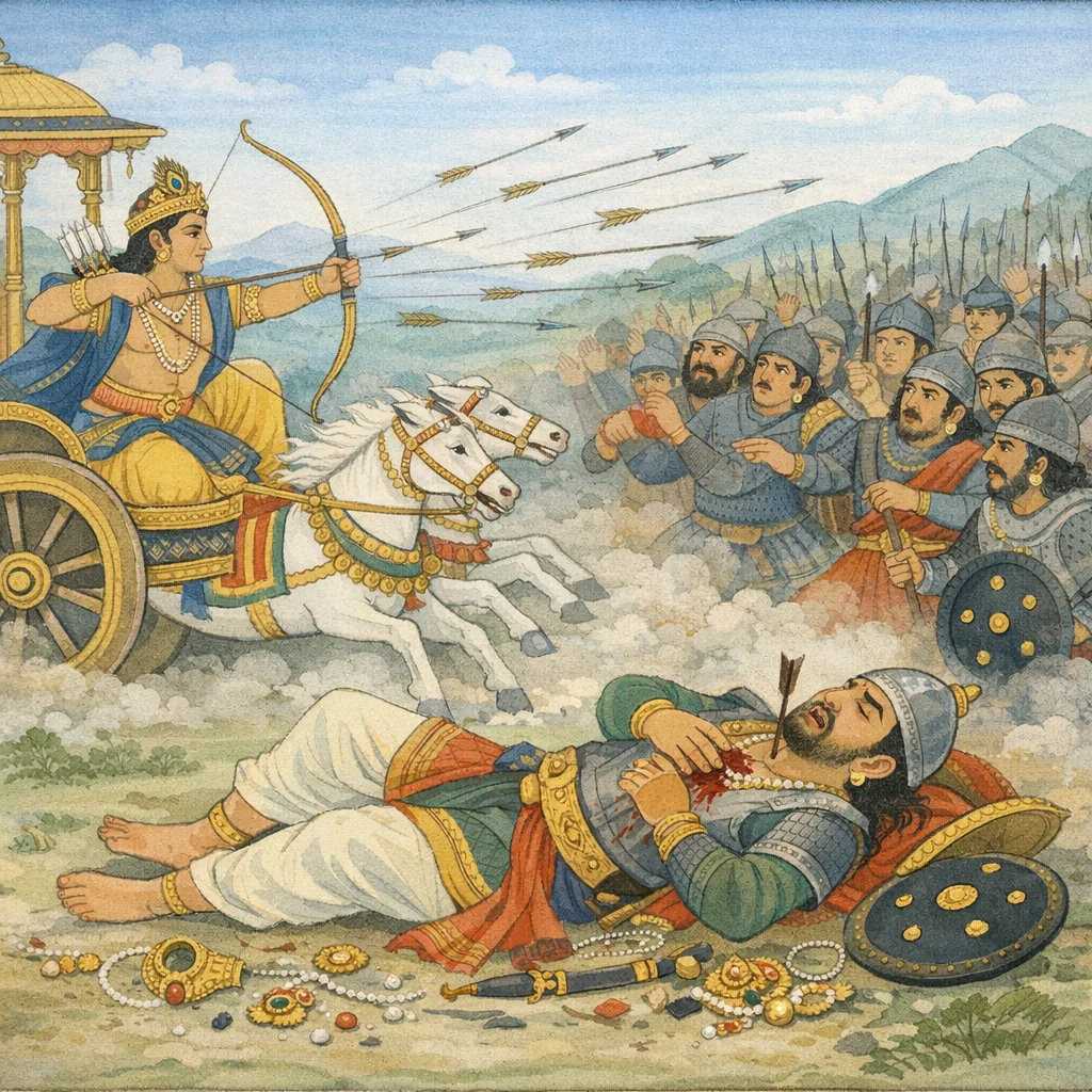 Chapter Arc: संजय धृतराष्ट्र को बताते हैं कि जयद्रथ द्वारा रोके जाने पर भी पाण्डव-पक्ष की विजय-लालसा थमती नहीं; उसी क्षण सत्यसंध, दुर्धर्ष, तेजस्वी अभिमन्यु अकेला ही कौरव-सेना के भीतर मकर की भाँति समुद्र में प्रवेश करता है। → अभिमन्यु बाण-वर्षा से कौरव-सेना में क्षोभ मचा देता है; रथसत्तम योद्धा उसे चारों ओर से घेरते हैं, रथ-रथ की टक्कर, शस्त्रों की झंकार और निरन्तर शर-वृष्टि से रणभूमि उबल उठती है। → विघ्न डालने के लिए वृषसेन का सारथि अभिमन्यु के रथ-प्रवाह में बाधा पहुँचाता है, पर अभिमन्यु क्षण भर में ही लोहमय कवचधारी वसातीय को दूरपाती बाण से हृदय में बेधकर धराशायी कर देता है; उसके क्रोध-प्रहार से शत्रुओं के धनुष, बाण, अंग-प्रत्यंग और शिर कटते दिखते हैं, और स्वर्णाभरणों की चमक ही दूर से दीखती रह जाती है। → कौरव-पंक्तियाँ क्षणिक रूप से टूटती हैं; अभिमन्यु का पराक्रम रणभूमि पर भय और विस्मय दोनों फैलाता है, और उसके चारों ओर पड़े कटे अस्त्र-शस्त्र व स्वर्णाभरण उसकी विजय-लहर का प्रमाण बनते हैं। → अभिमन्यु के इस उन्मत्त वेग को रोकने हेतु कौरव-पक्ष और अधिक कठोर घेरा कसने को उद्यत होता है—अगला प्रहार किस ओर से आएगा, यह अनिश्चित रह जाता है।