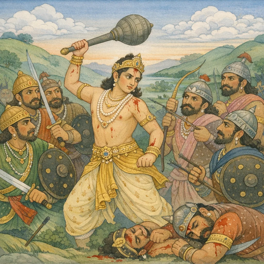 Chapter Arc: अकेला घिरा हुआ सौभद्र अभिमन्यु—धनुष, रथ, खड्ग और चक्र से वंचित—फिर भी रणभूमि में सूर्य-चन्द्र-सम तेज से खड़ा है; पृथ्वीपति वीर उसकी दुर्धर्ष देह-दीप्ति को देखते रह जाते हैं। → शत्रु-समूह उसे चारों ओर से दबाता है; अभिमन्यु महागदा उठा कर अंतिम प्रतिरोध करता है। गदा की ज्वलन्त वज्र-सी उठान देखकर रथोपस्थ के योद्धा पीछे हटते हैं, फिर भी बहुजन मिलकर उसे थकाते, काटते, और अवसर खोजते हैं। → दुःशासनपुत्र क्रोध में गदा लेकर दौड़ता है—“तिष्ठ तिष्ठ”—और उठते हुए अभिमन्यु के मस्तक पर गदा-प्रहार करता है; परवीरहा सौभद्र भूमि पर गिर पड़ता है। → अभिमन्यु के पतन से कौरवों में परा प्रीति और पाण्डवों में तीव्र व्यथा फैलती है; एक वीर का अंत बहु-योद्धाओं के बीच होता है, और रण का नैतिक ताप और बढ़ जाता है। → पाण्डव-पक्ष की शोकाग्नि प्रतिशोध में कैसे बदलेगी—और किस पर सबसे पहले गिरेगी—यह अगले प्रसंग की ओर कथा को धकेल देता है।