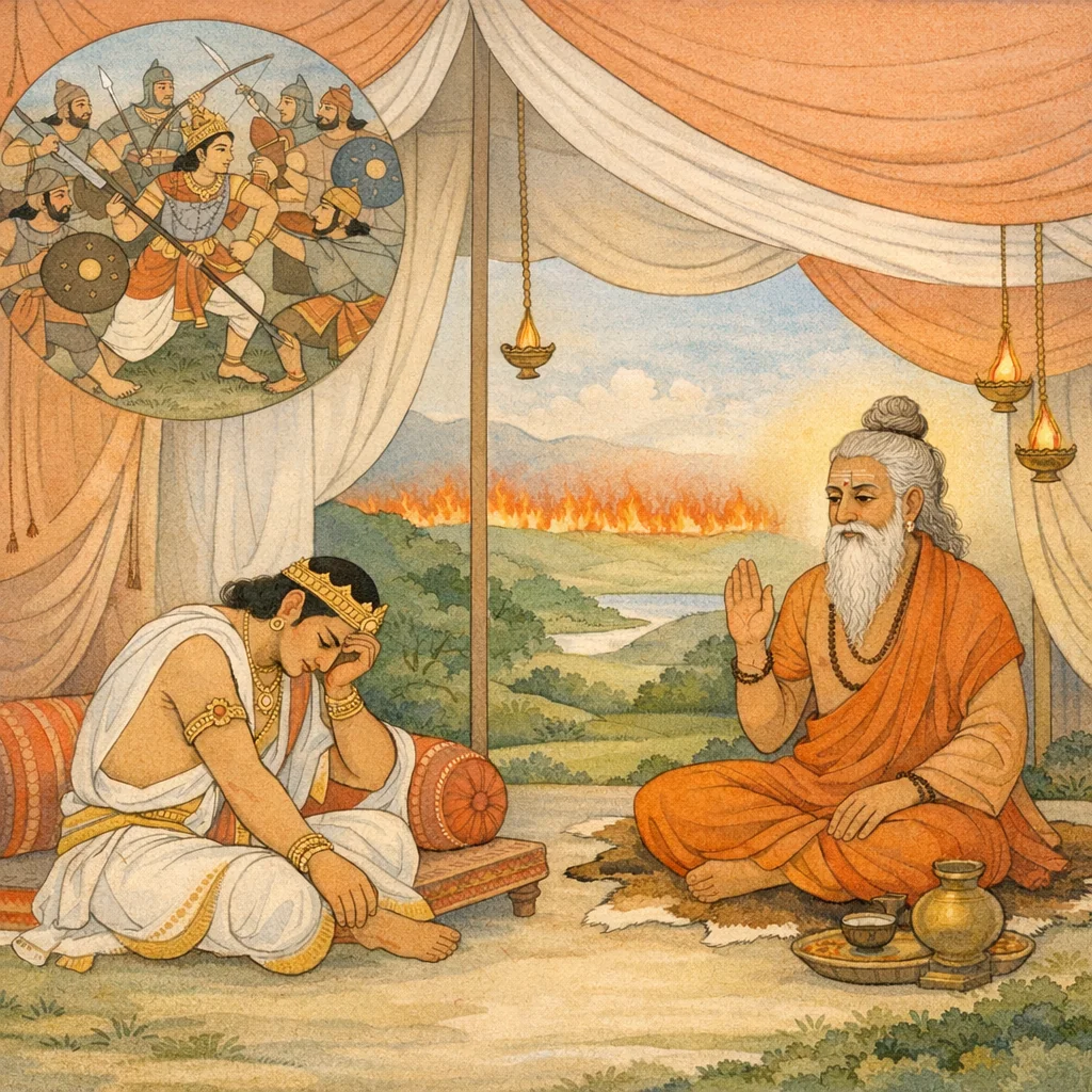 Chapter Arc: अभिमन्यु-वध के शोक से दग्ध युधिष्ठिर के शिविर में व्यास का आगमन होता है—राजा शोक में डूबा है, पर ऋषि का आगमन किसी गूढ़ उपदेश का संकेत देता है। → युधिष्ठिर व्यास की विधिवत पूजा कर बैठाते हैं और फिर टूटकर अपने भतीजे/पुत्रतुल्य अभिमन्यु के वध का वृत्तान्त कहते हैं—कैसे अनेक ‘अधर्मयुक्त’ महारथियों ने उसे घेरकर, उपाय-हीन अवस्था में, बालक होते हुए भी परवीरहा को रण में गिरा दिया। → व्यास युधिष्ठिर को शोक-बन्धन से छुड़ाने हेतु ‘मृत्यु की उत्पत्ति’ का ‘उत्तम’ आख्यान सुनाते हैं—एक प्राचीन कृतयुगीन प्रसंग (राजा अकम्पन आदि) के माध्यम से मृत्यु के विधान, उसके कारण और उसकी अनिवार्यता का रहस्य खोलते हैं; वर्णन में जगत् के दाह/ज्वालामाला से व्याप्त होने जैसी प्रलय-छवियाँ उभरती हैं। → कथा-उपदेश का लक्ष्य स्पष्ट होता है: युधिष्ठिर स्नेह-बन्धनजन्य दुःख से मुक्त हों, मृत्यु को दैवी-नियम के रूप में समझें, और शोक को धर्म-स्थैर्य में रूपान्तरित करें। → व्यास द्वारा मृत्यु-तत्त्व का आख्यान आगे भी विस्तार माँगता है—युधिष्ठिर का शोक क्या सचमुच शान्त होगा, और युद्ध-धर्म के कठोर निर्णयों पर इसका क्या प्रभाव पड़ेगा?
