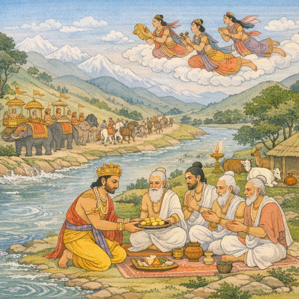 Narada said: “O Sṛñjaya, we have heard that King Bhagīratha has passed away—he by whom the river Gaṅgā was brought down to earth for the deliverance of the ancestors. His life is remembered as an act of responsibility toward forebears and as a model of royal duty: using power and austerity not for self-display, but to secure the welfare of those who depend upon the king, including those who came before.”