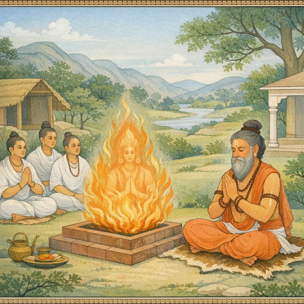 Nārada said: Pleased with him, Agni granted him a boon. Then Gaya chose his boon—seeking, through austerity, celibate discipline (brahmacarya), vows, and self-restraint, to attain Vedic knowledge by the grace of his teachers; to gain inexhaustible wealth while living according to dharma without causing harm to others; to continue giving gifts to brāhmaṇas with ever-increasing daily faith; to marry chaste maidens of his own varṇa and beget sons through them; to grow in devotion to the gift of food and remain steadfastly devoted to dharma; and to have no obstacles arise in his religious undertakings.