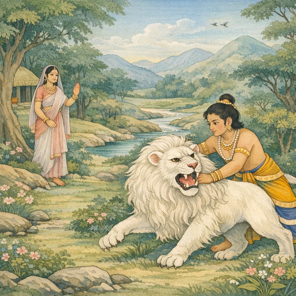 Nārada said: His might was immeasurable. By sheer force he would drag along even powerful buffaloes, and he could haul in hundreds of proud, raging lions as well. The words proclaim an extraordinary, almost superhuman strength, casting him as a fearsome figure in the war-epic’s grim arena.