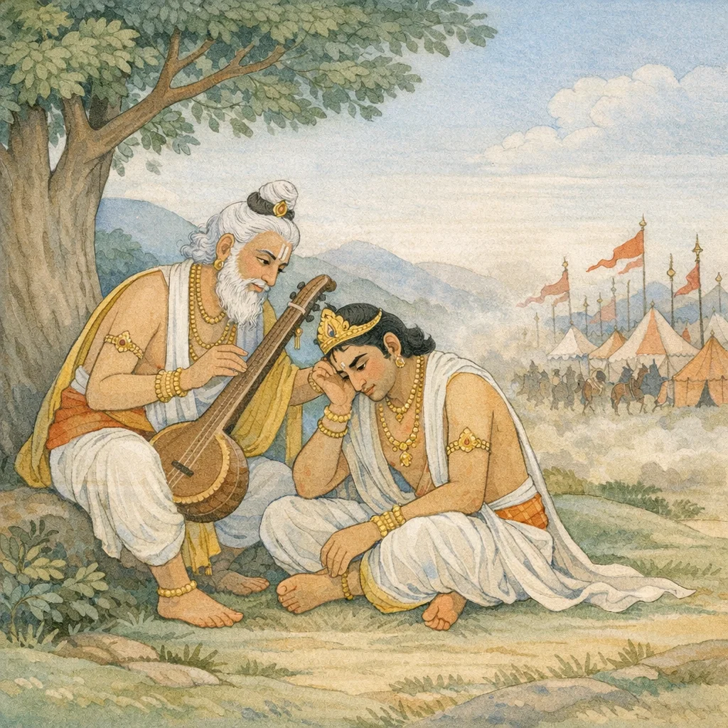 Chapter Arc: युद्ध-धूलि और शोक के बीच सृंजय मौन बैठा है; उसी मौन में नारद का आगमन होता है—मानो देववाणी स्वयं दुःख का कारण पूछने आई हो। → नारद सृंजय से पूछते हैं कि क्या कोई अपमान, कुल-कलंक या पुत्र-हानि ने उसे भीतर से तोड़ दिया है। सृंजय हाथ जोड़कर अपने शोक का कारण बताता है—पुत्र के भाग्य और मृत्यु की आशंका/स्मृति उसे जला रही है। → नारद आश्वासन देते हैं कि सृंजय का पुत्र युद्ध में ‘अकृतार्थ’ अवस्था में नहीं मरा; वह जीवित है और पुनः प्राप्त होगा—और साथ ही अभिमन्यु के विषय में कठोर सत्य रखते हैं: वह कृतार्थ होकर वीरगति को प्राप्त हुआ, स्वर्ग गया, इसलिए उसके लिए शोक नहीं, गौरव उचित है। → नारद धैर्य, स्थैर्य और विवेक का उपदेश देते हैं—जीवितों के लिए चिंता सार्थक है, स्वर्गगत के लिए शोक व्यर्थ। शोक से दुःख बढ़ता है; बुद्धिमान पुरुष हर्ष, सम्मान और धर्म-स्थित सुख का वरण करे। → व्यास का युधिष्ठिर को समझाकर अंतर्धान होने का संकेत अगले प्रसंग की ओर ले जाता है—शोक-शमन के बाद भी युद्ध का अनिवार्य प्रवाह रुकेगा नहीं।