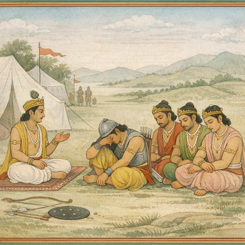 Chapter Arc: रणभूमि की धूल अभी बैठी भी नहीं कि धर्मराज युधिष्ठिर अपने मुख से वह वृत्तान्त खोलते हैं—चक्रव्यूह में फँसे सुभद्रानन्दन अभिमन्यु का वध कैसे हुआ। → युधिष्ठिर बताते हैं कि पाण्डवों ने रथों की सेनाओं के व्यूह रच-रचकर द्रोण को रोकने का यत्न किया, पर आचार्य बार-बार प्रतिव्यूह भेदते हुए आगे बढ़ते रहे; और जब वे रथियों द्वारा रोके भी गये, तब भी संकट का भार अभिमन्यु पर आ गिरा—उसे ‘नीक भेद’ करने को उकसाया गया, मानो बालक-वीर ही समस्त सेना का द्वार हो। → युधिष्ठिर का वचन अभिमन्यु-वध के नैतिक घाव को खोल देता है—जयद्रथ को न मार पाने पर वे उन नरकों/लोकों का स्मरण करते हैं जो पितृघाती, गुरु-पत्नीगामी और पिशुन को मिलते हैं; और फिर निर्णायक वाक्य आता है कि ‘पुरुषव्याघ्र अभिमन्यु स्वर्गलोक को प्राप्त हुआ’—यही शोक का शिखर है। → यह समाचार सुनते ही अर्जुन ‘हा पुत्र’ कहकर व्यथित होकर भूमि पर गिर पड़ते हैं; पाण्डव-समूह स्तब्ध, अनिमिष नेत्रों से एक-दूसरे को देखते हैं—शोक सामूहिक हो जाता है और कथा का स्वर विलाप से प्रतिज्ञा की ओर मुड़ने लगता है। → अर्जुन होश में आकर क्रोध से काँपते हुए उन्मत्त-सा वचन आरम्भ करते हैं—अब यह शोक प्रतिशोध में बदलेगा, और जयद्रथ के भाग्य का निर्णय निकट है।