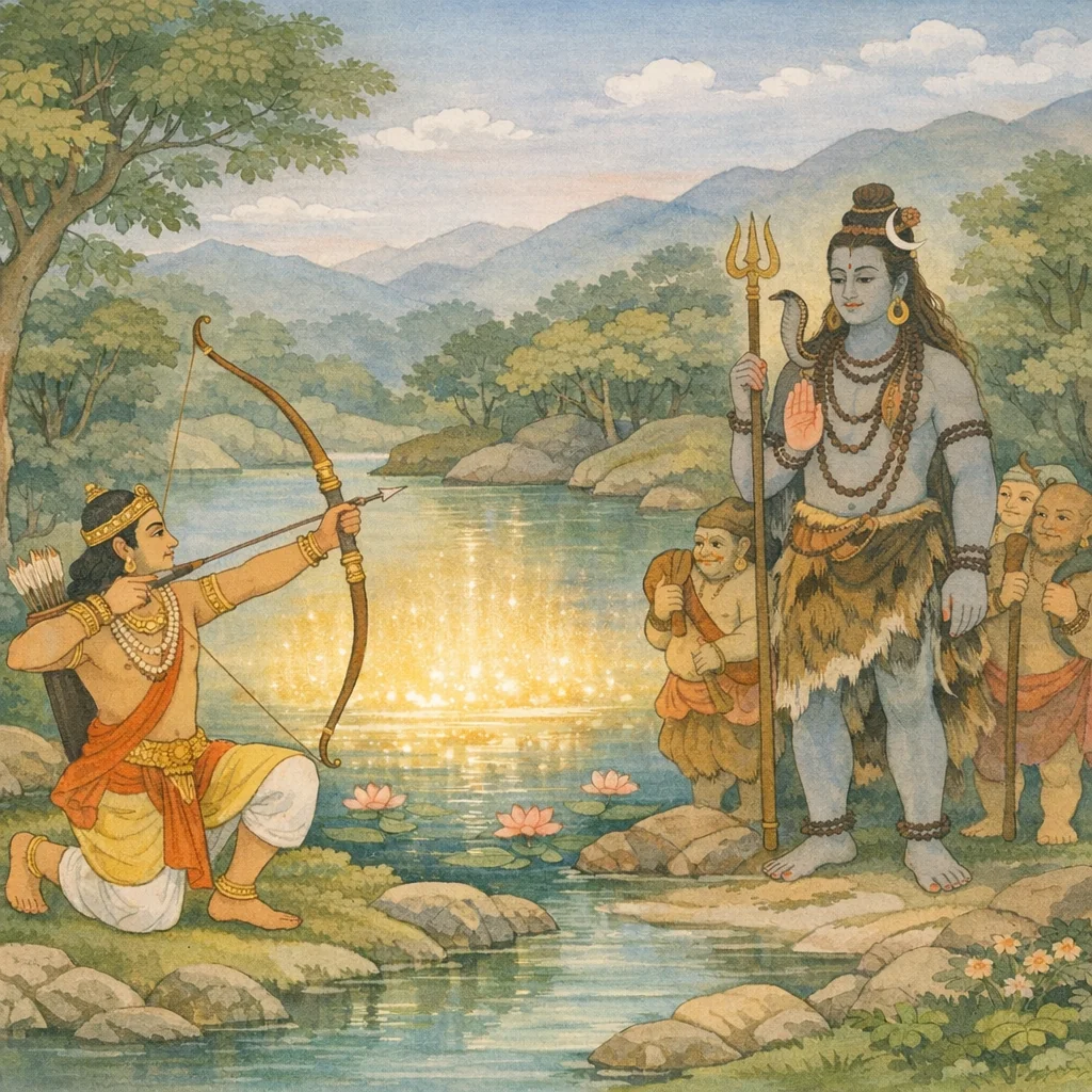 स सरस्येव तं बाणं मुमोचातिबल: प्रभु: । चकार च पुनर्वीरस्तस्मिन् सरसि तद् धनुः,तत्पश्चात् अत्यन्त बलशाली वीर भगवान् शिवने उस बाणको उसी सरोवरमें छोड़ दिया। फिर उस धनुषको भी वहीं डाल दिया