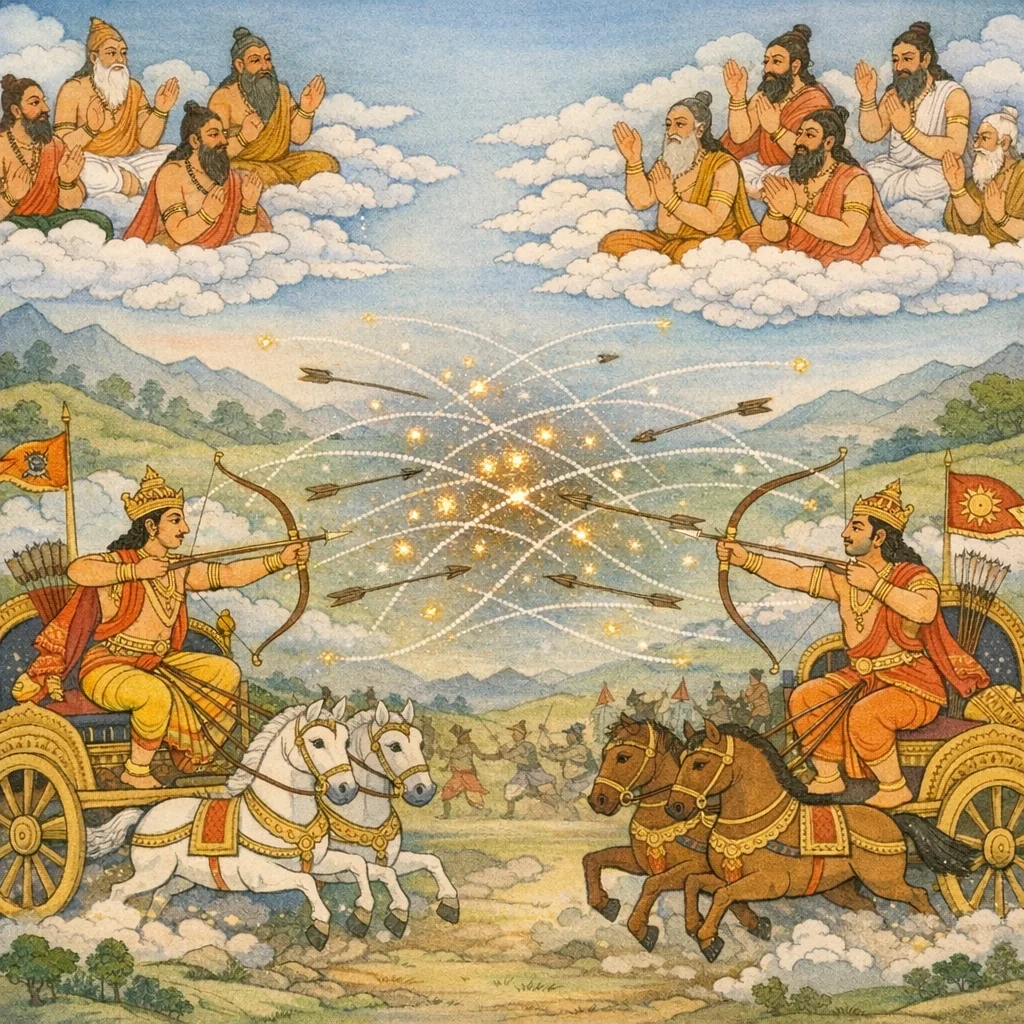 Sañjaya said: “Seeing the wondrous and almost inconceivable feats performed by those two in the battle, the assembled hosts of Siddhas and Cāraṇas were seized with astonishment. The scene on the battlefield made even the celestial witnesses marvel at the extraordinary power and resolve on display.”