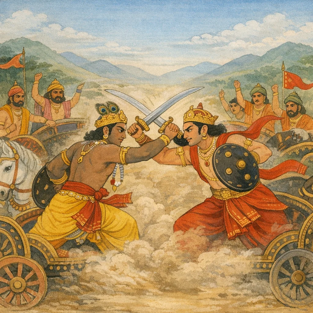Chapter Arc: संजय धृतराष्ट्र को दिखाते हैं—सहदेव क्रोधाग्नि-सा धधकता हुआ कौरव वाहिनी को जलाता बढ़ रहा है; तभी भाई-द्वेष और कुल-रक्षा के आवेग में दुःशासन उसे रोकने को ललकारता है। → दोनों भाई रणभूमि में आमने-सामने आते हैं; आसपास खड़े महारथी सिंहनाद करते हैं, वस्त्र झटकते हैं—मानो युद्ध का रंगमंच स्वयं श्वास रोक ले। धनुष-बाण, फिर तलवार और पुनः धनुष—अस्त्रों का क्रम बदलता है, और प्रहारों की तीव्रता बढ़ती जाती है। → दुःशासन सहदेव पर तीखी तलवार घुमाकर वार करता है, फिर दूसरा धनुष लेकर बाण साधता है; प्रत्युत्तर में सहदेव की प्रहार-श्रृंखला और रथ-युद्ध की गति इतनी तीव्र हो जाती है कि अंततः वह दुःशासन को रण में पराजित कर देता है। → दुःशासन की पराजय के बाद सहदेव दुर्योधन की सेना/बल को देखकर उसे भी दबाने-रौंदने लगता है—कौरवी सेना ‘पिपीलिका’ (चींटी) की तरह मर्दित-सी प्रतीत होती है। → पराजय के अपमान से तिलमिलाए कौरव पक्ष की प्रतिक्रिया और दुर्योधन-बल का प्रत्याघात अगले प्रसंग में और उग्र होने का संकेत देता है।