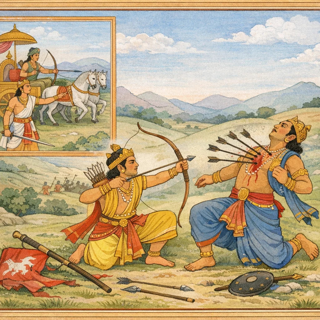 Chapter Arc: कर्णपर्व के रण-कोलाहल में एक तीखा उपाख्यान उभरता है—उलूक का युद्ध, और धृतराष्ट्र-पुत्र युयुत्सु का उसके सामने डट जाना; साथ ही शतानीक, श्रवकर्मा, सुतसोम और शकुनि के घोर संग्राम की भूमिका बनती है। → युयुत्सु तीक्ष्णधार बाणों से उलूक पर प्रहार करता है, पर उलूक क्रुद्ध होकर क्षुरप्र से उसका धनुष काट देता है और कर्णिका-प्रहारों से दबाव बढ़ाता है। युयुत्सु का स्वर्णध्वज दण्ड कटने से गिर पड़ता है; ध्वज-विध्वंस देखकर युयुत्सु क्रोधोन्मत्त होकर उलूक के वक्ष में पाँच बाणों से प्रतिघात करता है। समानांतर मोर्चे पर सुतसोम रथ-घोड़े-ध्वज नष्ट होने पर भी धनुष लेकर भूमि पर उतरता है और पैदल होकर भी रथस्थ शकुनि से भिड़ता है—यह दृश्य योद्धाओं और सिद्धों तक को विस्मित करता है। → सुतसोम का ‘विरथ होकर भी’ शकुनि के साथ अद्भुत युद्ध चरम पर पहुँचता है; फिर वह श्रुतकीर्ति के विशाल रथ पर चढ़कर पुनः वेग पाता है। उधर सौबलपुत्र शकुनि निर्भय विचरता हुआ पाण्डवानीक में आतंक फैलाता है—उसके पराक्रम पर पाण्डव-दल में सिंहनाद भी उठता है, पर वही शकुनि अनेक शत्रुगणों को रौंदता-भगाता दिखाई देता है। → अध्याय का निष्कर्ष निर्णायक वध नहीं, बल्कि रण-स्थितियों के पलटाव में है—युयुत्सु-उलूक का द्वंद्व ध्वज-भंग और प्रतिघातों के बाद भी खुला रहता है; सुतसोम का पुनः रथारोहण पाण्डव पक्ष को क्षणिक संबल देता है, पर शकुनि का दबदबा पाण्डवानीक को पीछे ढकेलता है। → शकुनि द्वारा पाण्डव-सेना के द्रवित होने का दृश्य आगे के अध्याय में बड़े विघटन या प्रतिकार की आशंका छोड़ देता है।