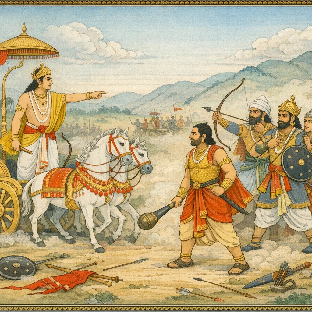 Sañjaya said: The great chariot-warrior struck down Duryodhana’s four horses with four arrows; then, with a fifth, he severed the charioteer’s head from the body and cast it down. The scene underscores the ruthless precision of battlefield skill, where tactical necessity and the erosion of restraint move side by side amid the collapse of dharmic order in war.