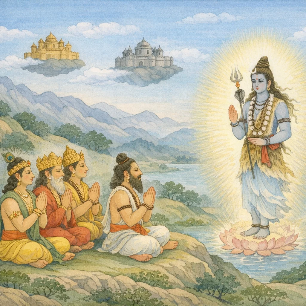 They bowed again and again, saying, “Homage, homage—salutations to you, O Lord!” Having received the command of the blessed Three‑eyed Lord, the gods grew calm and composed, and then began to praise him thus: “O Lord, we bow to you repeatedly.”