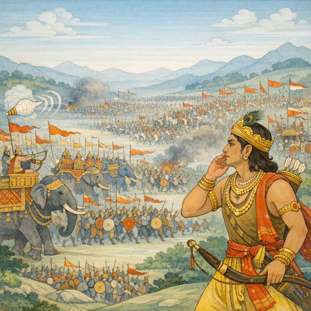 Chapter Arc: रणभूमि पर शंख-नाद और रथों की गर्जना से धरती काँप उठती है; कौरव-सेना अपनी व्यूह-रचना में सघन, चमकती और भय-उत्पादक दिखाई देती है। → कौरवों की ओर से विविध जातियों-गणों के सैनिक, पदाति-नाग-रथ, पट्टिश-खड्गधारी सहस्रों अविचल योद्धा, और वाद्यों का कोलाहल—सब मिलकर एक विराट युद्ध-चित्र रचते हैं। उधर प्रतिव्यूह रचने को महातेजस्वी योद्धा क्रोध से काँपते-से आगे बढ़ते हैं; ध्वजाओं, पताकाओं और कवचों की स्वर्ण-रजत आभा युद्ध को उत्सव-सा और मृत्यु को निकट-सा बनाती है। → कर्ण के सम्मुख दोनों पक्षों की सेनाएँ अपने-अपने ध्वज, रथ-शोभा, प्रत्यंचा-शब्द, बाणों की सनसनाहट, मनुष्य-घोड़े-रथ के कोलाहल के साथ एक साथ उफनती हैं—ऐसा क्षण जब व्यूह-रचना और ध्वज-वैभव स्वयं युद्ध की घोषणा बन जाते हैं। → अध्याय का अंत वास्तविक द्वंद्व-परिणाम से अधिक ‘युद्ध के आरम्भ-क्षण’ की स्थापनाओं में होता है—सेनाएँ सज्ज, व्यूह स्थिर, और कर्ण के लिए संकेत स्पष्ट कि अब निर्णायक टक्कर निकट है। → कर्ण के सामने उठती ध्वज-पंक्तियाँ और प्रत्यंचा-नाद अगले अध्याय में सीधे प्रहार और प्रमुख मुठभेड़ों का द्वार खोलते हैं।