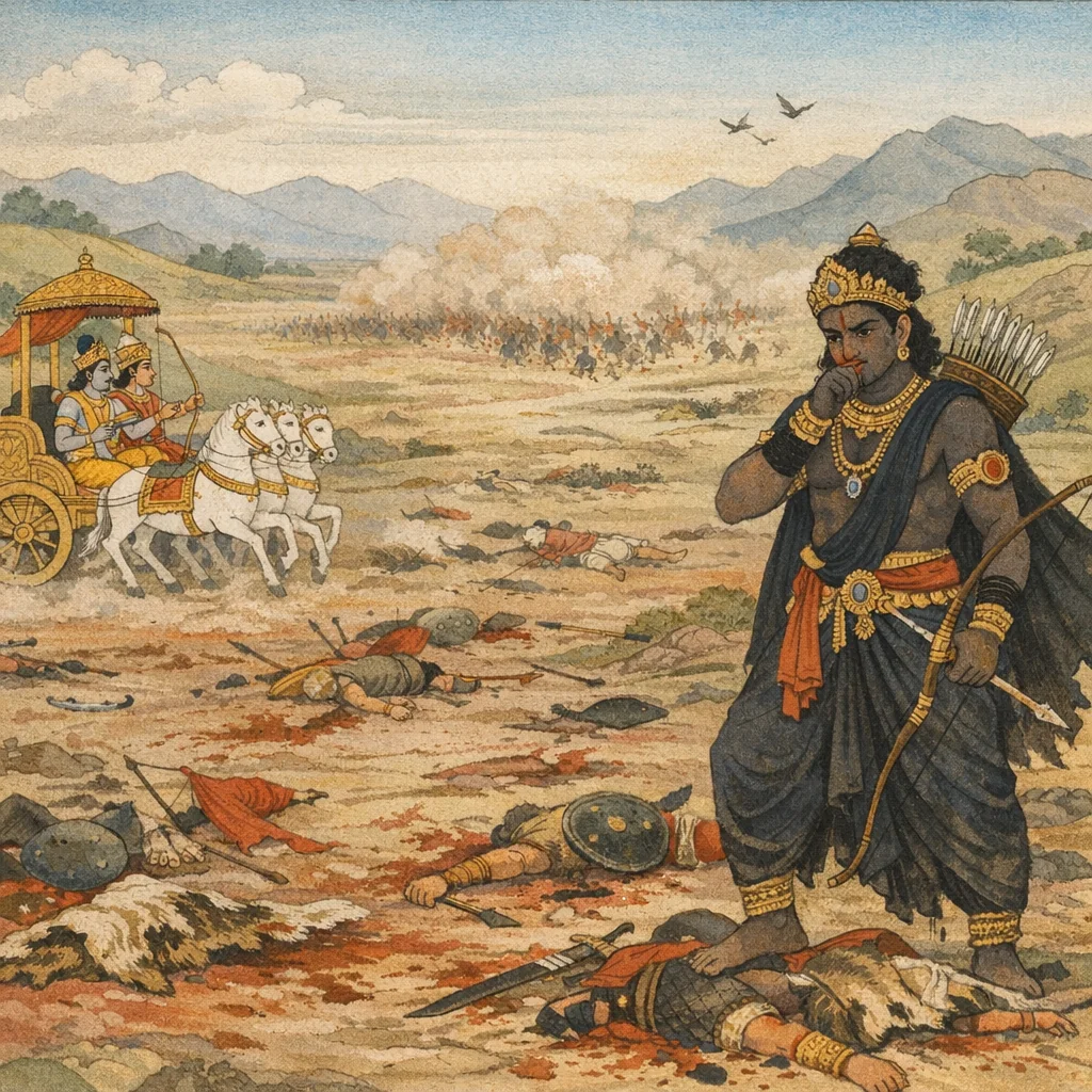 Chapter Arc: द्रोणपुत्र (अश्वत्थामा) सहित अनेक महारथियों को पराजित कर अर्जुन रथ पर खड़े-खड़े वासुदेव से कहता है कि अब युधिष्ठिर के पास चलें—पर सामने ही पाण्डव-सेना का बिखराव और कर्ण का प्रचण्ड संहार दिख रहा है। → अर्जुन कृष्ण को संकेत करता है—“देखो, पाण्डवी चमू भाग रही है; और कर्ण संग्राम में महारथियों को काल के समान काट रहा है।” हरि अर्जुन के वचन से रथ बढ़ाते हैं, और चलते-चलते युद्धभूमि के दृश्य—हाथियों के झूल, मृगचर्म, कम्बल, टूटे अंकुश, रक्त-कीचड़, दाँतों से ओठ चबाते, भ्रुकुटि टेढ़ी किए क्रोध-भरे योद्धा—सब मिलकर विनाश का विराट चित्र रचते हैं। → गोविन्द अर्जुन को युद्ध-त्याग/विराम की भूल का बोध कराते हैं—जनक्षय के बीच वे बताते हैं कि ‘मृत्यु’ को निमित्त बनाकर पीछे हटना क्षत्रिय-धर्म नहीं; और उसी क्षण युद्धभूमि का चरम भयावह दृश्य उभरता है: पर्वताकार हाथी-घोड़े ढेर, जीभें बाहर निकलीं, वैजयन्ती पताकाएँ बिखरीं, पृथ्वी शोणित-कर्दम से सनी, जल के लिए दौड़ते योद्धा प्यास में प्राण त्यागते। → अध्याय का निष्कर्ष अर्जुन के भीतर ‘कर्तव्य-स्मरण’ की ओर झुकाव है—कृष्ण का उपदेश उसे वर्तमान संकट (कर्ण की धावा और पाण्डव-सेना का विचलन) के प्रति सजग करता है, और युद्धभूमि की साक्षी-भाषा उसे बताती है कि अब निर्णय विलम्ब का नहीं, धैर्य और धर्म का है। → कर्ण के बढ़ते प्रहार के बीच अर्जुन-कृष्ण का रथ युधिष्ठिर की ओर बढ़ता है—पर क्या वे समय रहते पाण्डव-सेना का मनोबल और व्यवस्था संभाल पाएँगे?