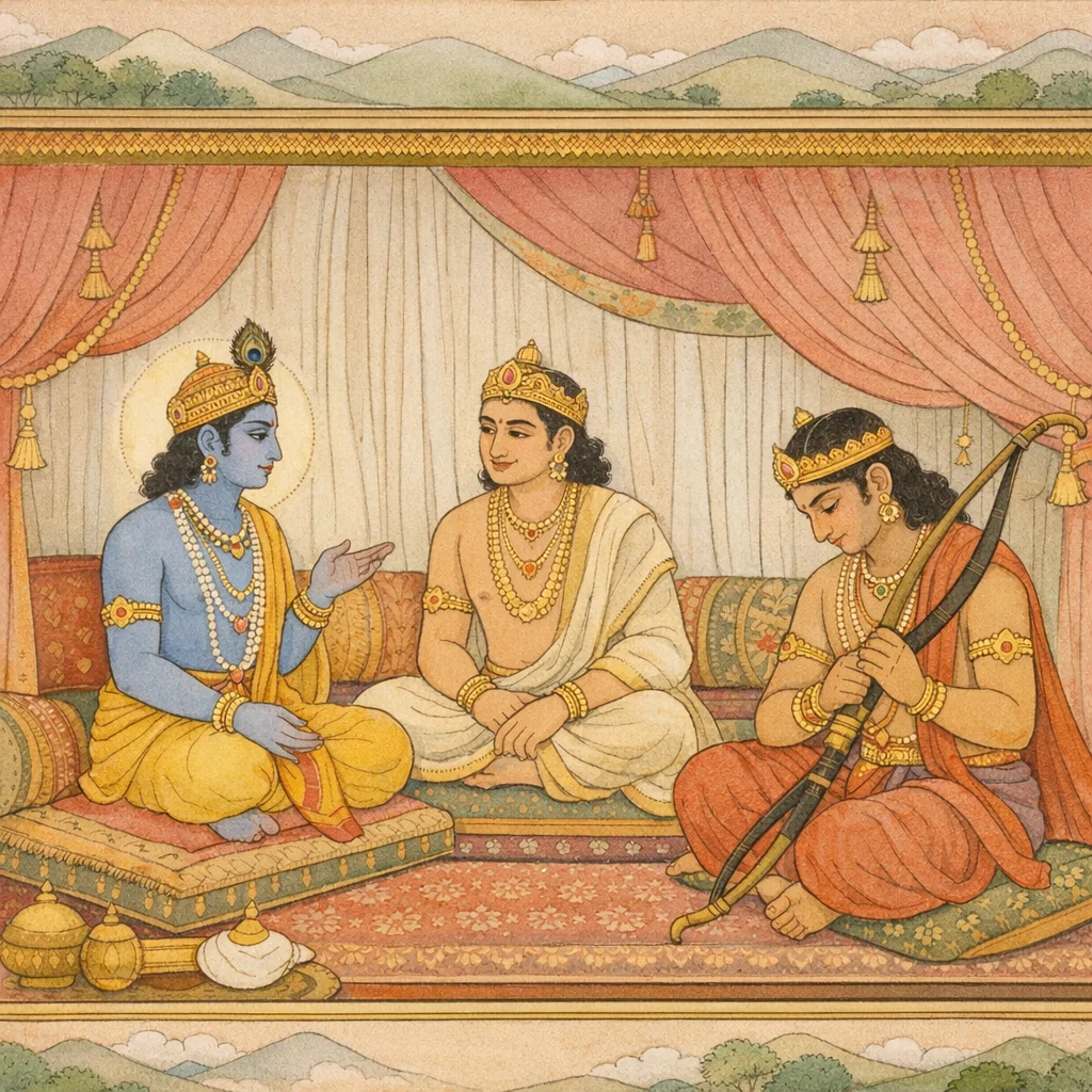 Chapter Arc: कर्ण-वध की घड़ी निकट है, पर उससे पहले अर्जुन के भीतर एक और युद्ध उठ खड़ा होता है—युधिष्ठिर के प्रति कहे गये तिरस्कारपूर्ण वचनों का पश्चात्ताप, मानो उसने धर्म के विरुद्ध कोई पातक कर डाला हो। → अर्जुन का मन ग्लानि से भरता है; वह अपने ही वचन-बाणों से घायल है। श्रीकृष्ण उसकी दशा देखकर उसे रोकते-टोकते, हँसते-से, उसे धर्म की मर्यादा और क्षत्रिय-कर्तव्य की सीमा याद दिलाते हैं—क्रोध में उठे ‘तीक्ष्णधार’ संकल्पों को शमन करते हैं और उसे युधिष्ठिर के पास लौटने को प्रेरित करते हैं। → श्रीकृष्ण युधिष्ठिर से कहते हैं कि वे अर्जुन को सान्त्वना दें और दुरात्मा कर्ण-वध के लिए आज्ञा प्रदान करें; तब अर्जुन प्रतिज्ञा करता है—आज ही रण में राधेय कर्ण को शरों से अन्त तक पहुँचाऊँगा। → धर्मराज युधिष्ठिर प्रसन्न होकर, बार-बार मुस्कराते हुए, अर्जुन को अनुमति और आशीर्वाद देते हैं; अर्जुन का अपराध-बोध क्षमा और आदेश में रूपान्तरित होकर एकाग्र संकल्प बन जाता है। श्रीकृष्ण भी आश्वस्त करते हैं कि अर्जुन कर्ण-वध में समर्थ है। → आज्ञा मिल चुकी है—अब अगला चरण केवल रणभूमि है: क्या अर्जुन का संकल्प कर्ण के कवच-कुण्डल-यश और भाग्य-चक्र को भेद पाएगा?