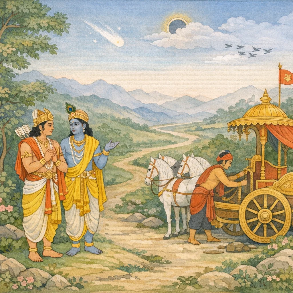 Sañjaya said: Seeing Arjuna, wielder of the Gāṇḍīva, setting forth with his mind seized by anxious thought, Lord Śrī Kṛṣṇa addressed him thus. Then comes a stern call to make the chariot ready—yoke again the finest horses, arm the great car with every weapon—and to depart at once with the resolve to slay the “charioteer’s son” (Karna). In its ethical cadence it presses the urgency of battle-duty and firm resolve, while revealing the inward strain that even a righteous warrior may carry into war.