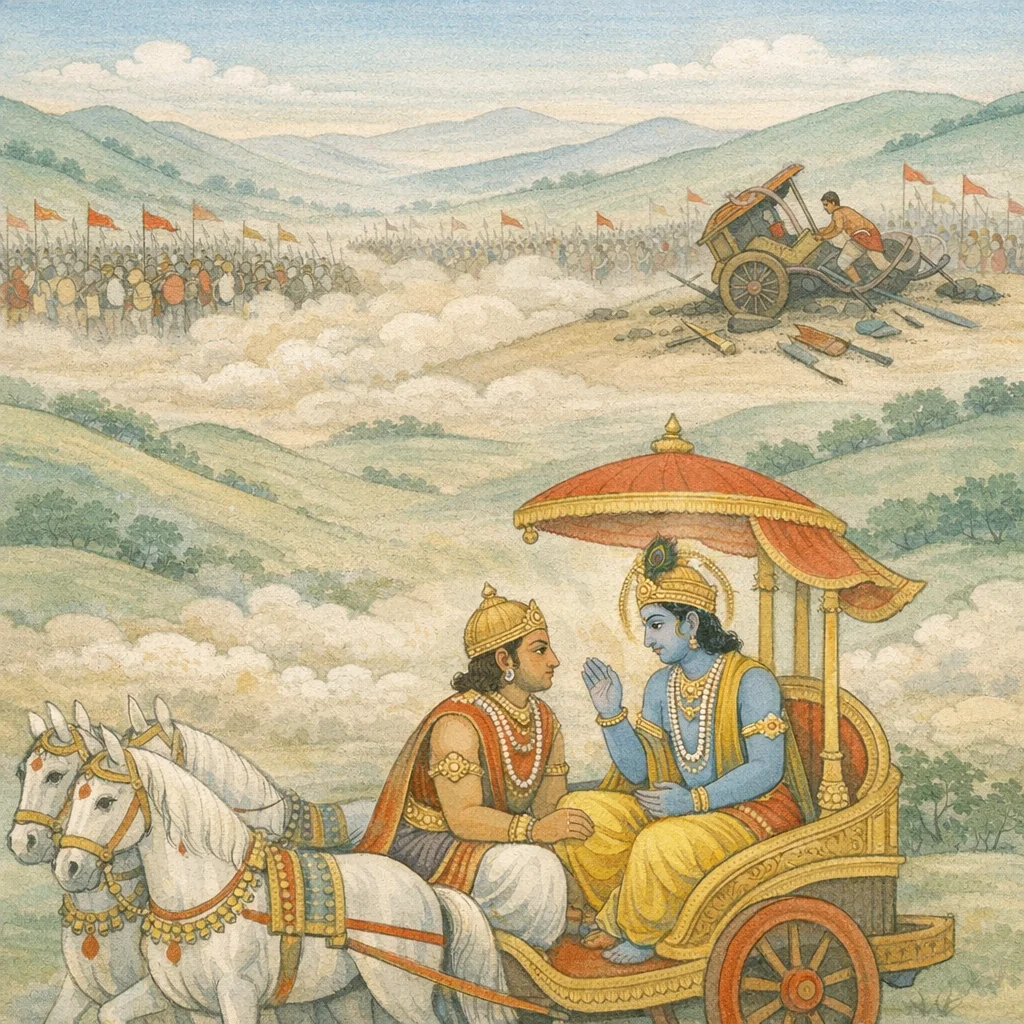 Chapter Arc: संजय धृतराष्ट्र से कहते हैं कि कर्ण-वध के लिए कृतसंकल्प अर्जुन जब आगे बढ़ते हैं, तब भगवान श्रीकृष्ण उन्हें फिर से संबोधित करते हैं—मानो निर्णायक घड़ी से ठीक पहले अंतिम, अचूक स्मरण दिला रहे हों। → कौरव-सेना का घनघोर संमेलन होता है—अक्षौहिणीपति, अस्त्र-विशारद, युद्धोन्मत्त नायक एक साथ जुटते हैं; श्रीकृष्ण अर्जुन को बताते हैं कि ऐसे संहत, दुर्धर्ष समूह को तुम्हारे बिना कोई जीत नहीं सकता। भीष्म और द्रोण के पराक्रम का स्मरण युद्धभूमि पर भय और सम्मान दोनों बढ़ाता है, और अर्जुन पर ‘एकमात्र निर्णायक’ होने का भार चढ़ता जाता है। → रण में थकान और प्रहारजनित श्रम से योद्धा ‘सुविह्वल’ होते हैं; उसी उथल-पुथल के बीच भविष्यवाणी-सा दृश्य उभरता है—राजाओं को कर्ण का रथ से गिरना, रक्त में डूबकर पृथ्वी पर पड़ा होना, और उसके आयुध बिखरे देखना पड़ेगा। यह अध्याय कर्ण-वध की अनिवार्यता को दृश्य-रूप में सामने रखकर चरम पर पहुँचता है। → कृष्ण का उपदेश अर्जुन के संकल्प को धार देता है: यह केवल व्यक्तिगत द्वंद्व नहीं, बल्कि युद्ध के प्रवाह को मोड़ने वाला कर्म है। कौरव-बल की भीषणता के बावजूद पाण्डव-पक्ष के लिए निर्णायक आशा अर्जुन के हाथों में केंद्रित होती है। → कर्ण के पतन का चित्र सामने रखकर कथा अगले क्षण पर रोक दी जाती है—क्या यह दृश्य अभी घटेगा, और किस क्रम में कौरव-वीर टूटेंगे?