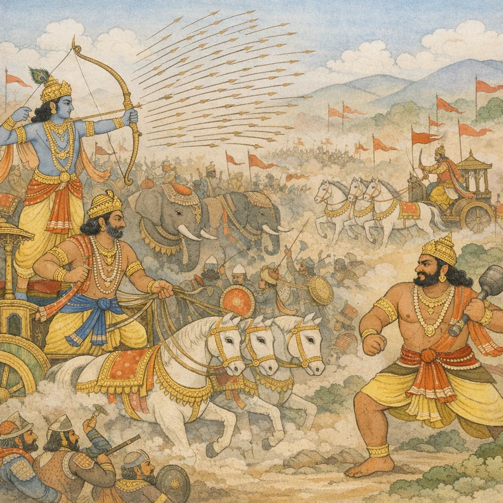 Chapter Arc: संकुल युद्ध की धूल में संशप्तक वीर परलोक-संबंधी घोर शपथ लेकर अर्जुन को घेरते हैं—मानो आज ही उसका रथ रोककर प्राण-दान मांगेंगे। → कौरव-सेना की भीड़ और थकान के बीच भी उन्मत्त गजदल आगे बढ़ता है; अर्जुन की गति अवरुद्ध होती है। उधर श्रीकृष्ण स्वर्ण-भूषणों और मुक्ताजाल से सुसज्जित श्वेत अश्वों को कर्ण-रथ की ओर साधते हैं—रण का केंद्र कर्ण-अर्जुन की ओर खिंचने लगता है। → भीमसेन कालरात्रि-सदृश प्रचंड रूप धारण कर मनुष्य-हय-गज का संहार करते हुए कौरव-सेना में आतंक का ज्वार उठाते हैं; साथ ही अर्जुन के बाणों से नराश्वनागों का महान आर्तनाद गूंजता है और रथ, सादी, हय, गज—कोई भी अखंड नहीं बचता। → कर्ण मित्रहित में, मित्रगृद्धि से प्रेरित होकर, पाञ्चालों पर शर-सहस्रों की वर्षा करता है; पाञ्चाल-सेना में भारी शब्द और भगदड़ फैलती है, और युद्ध का पलड़ा क्षण भर को कर्ण की ओर झुकता है। → कर्ण की तीव्र बाण-वृष्टि के बाद रण का अगला मोड़—क्या अर्जुन-भीम इस दबाव को तोड़कर कर्ण तक पहुंचेंगे—अध्याय के अंत में अधर में लटकता है।