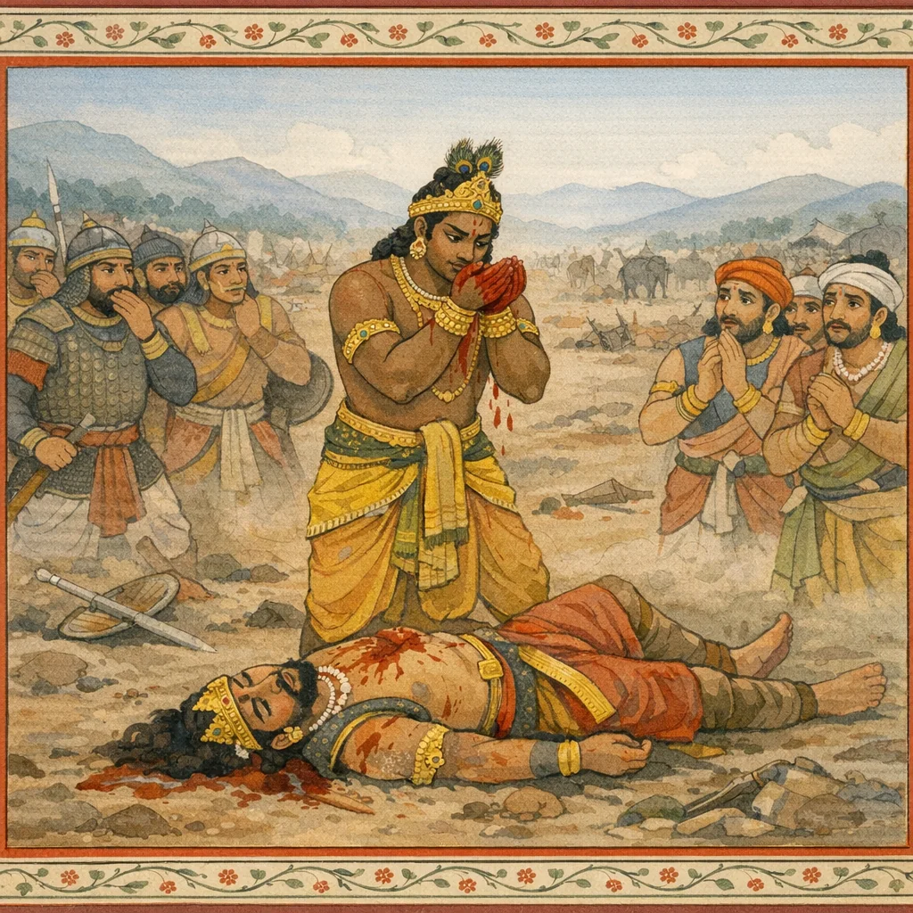 Sañjaya said: “We too are now dancing in return, again and again crying, ‘Ox! Ox!’—mocking those very men who, on that earlier day in the Kaurava court, exulted and danced as they jeered at us with the same insult.”