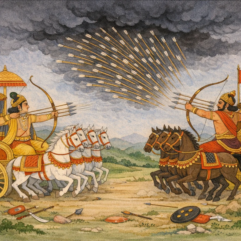 Chapter Arc: संजय धृतराष्ट्र से कहता है कि आपकी कुमन्त्रणाओं के फलस्वरूप रणभूमि में शंख-भेरी की गम्भीर ध्वनि उठी—और श्वेत अश्वों वाले दो नरश्रेष्ठ, अर्जुन और कर्ण, आमने-सामने आ खड़े हुए। → दोनों वीर वैर को विषधर सर्पों की तरह फुफकारते, अग्नि की तरह दहकते हुए धनुष-डोरियों की टंकार और बाण-वर्षा से एक-दूसरे पर टूट पड़ते हैं—मानो मेघ-से-मेघ भिड़ रहे हों। बीच-बीच में पाञ्चालों के वध का कटु स्मरण अर्जुन के पक्ष में क्रोध और प्रतिशोध को और तीखा करता है; भीम भी सत्यसंध अर्जुन को उकसाता है कि कर्ण के प्रहारों का उत्तर निर्णायक अस्त्रों से दे। → अस्त्रों की पराकाष्ठा पर अर्जुन दिशाओं-प्रदिशाओं को बाणों से ढक देता है; दिव्यास्त्रों से आकाश में घोर अन्धकार छा जाता है, पक्षी तक मार्ग नहीं पाते। इसी उन्मत्त क्षण में अर्जुन कर्ण-शल्य और कुरु-सेना पर तीव्र प्रहार करता है, और कर्ण भी प्रत्युत्तर में अर्जुन को तथा उसके रथ-परिसर को बाणों से छलनी करता है—रण का केंद्र एक ही द्वंद्व में सिमट जाता है। → अध्याय का अंत किसी एक के निर्णायक पतन पर नहीं, बल्कि दोनों के असाधारण शौर्य, अस्त्र-प्रतिअस्त्र की काट, और युद्ध-क्षेत्र में बढ़ती हुई अराजकता/अन्धकार के साथ होता है—जहाँ अर्जुन का प्रचण्ड प्रहार क्षणिक बढ़त देता है, पर कर्ण की प्रतिरोध-शक्ति युद्ध को फिर बराबरी पर खींच लाती है। → दिव्यास्त्रों से छाए अन्धकार और निरन्तर बाण-वर्षा के बीच यह प्रश्न लटकता रह जाता है कि अगला निर्णायक प्रहार किसका होगा—अर्जुन का या कर्ण का।