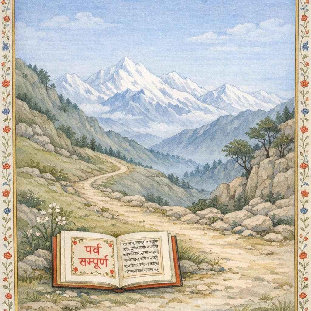 Chapter Arc: स्वर्गारोहण-विषयक पूर्व अध्याय के समापन के बाद कथा-धारा एक विराम-रेखा पर आती है—मानो महाप्रस्थान की यात्रा अब शब्दों से परे, मौन की ओर बढ़ रही हो। → यह अध्याय कथानक-घटना से अधिक ‘समापन-घोष’ का रूप लेता है: महाप्रस्थानिकपर्व की पूर्णता का संकेत, छन्द-गणना/पाठ-परंपरा का उल्लेख, और ग्रंथ-समाप्ति का औपचारिक उद्घोष—इनसे पाठक के भीतर ‘अब कुछ शेष नहीं’ का भारीपन बढ़ता है। → ‘महाप्रस्थानिकपर्व सम्पूर्ण’—यह वाक्य ही चरम है: पाण्डव-यात्रा का लौकिक अंत, और महाभारत के उत्तर-प्रवाह का एक द्वार बंद होना। → अध्याय का समाधान कथा में नहीं, ग्रंथ-परंपरा में है—पर्व-समाप्ति की मुहर, छन्द/अनुष्टुप्-गणना का संकेत, और पाठ-सम्पादन की सूचना के साथ समापन।