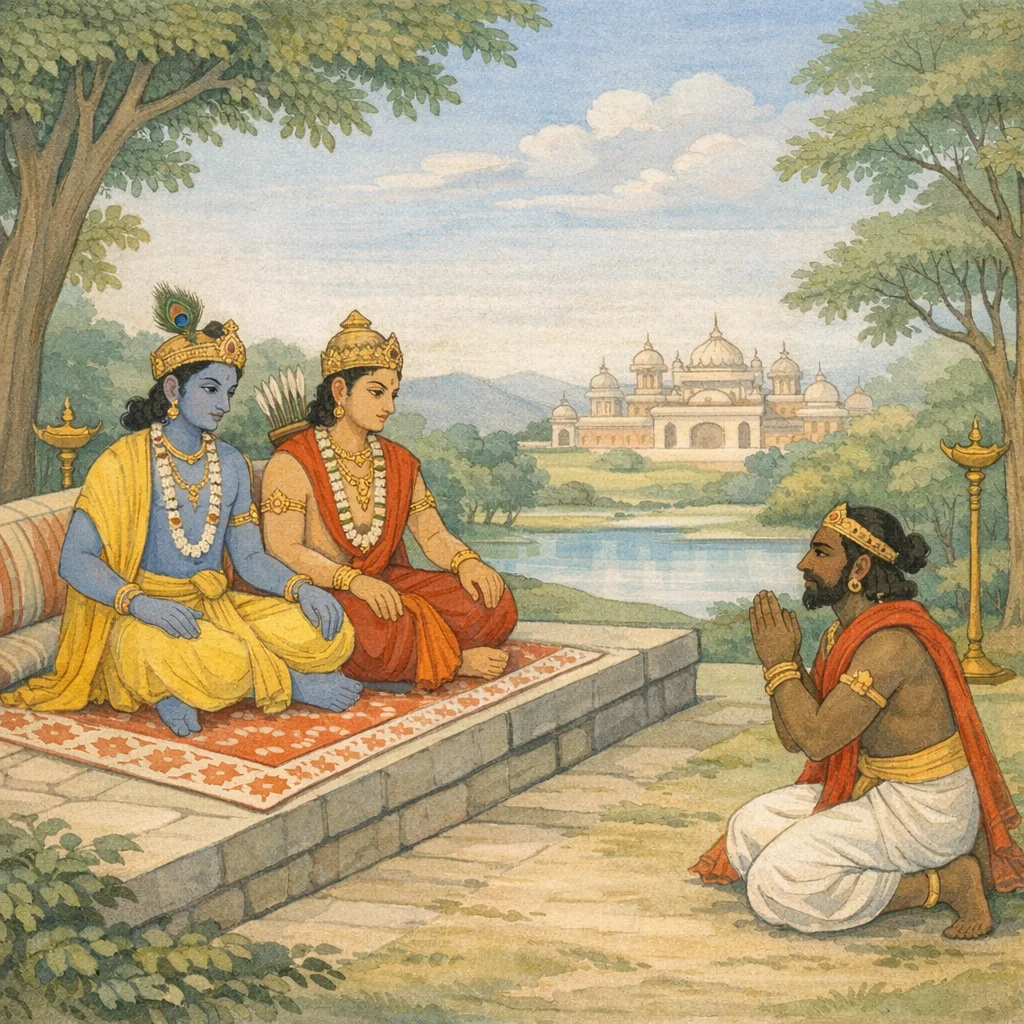 Chapter Arc: खाण्डवदाह के अनन्तर, जनमेजय के समक्ष वैशम्पायन उस अद्भुत क्षण का सूत्र पकड़ते हैं जब मयासुर—अग्नि के दाह और कृष्ण के क्रोध से घिरा—अर्जुन के शरणागत होकर अपने प्राण-रक्षण का ऋण स्वीकार करता है। → मयासुर स्वयं को दानवों का विश्वकर्मा और महाकवि बताकर प्रतिदान माँगता नहीं, बल्कि प्रतिदान देने की उत्कंठा प्रकट करता है—‘ब्रूहि किं करवाणि ते’; प्रश्न यह बनता है कि पाण्डव किस प्रकार का वर स्वीकार करें जो उनके यश, राज्य-प्रतिष्ठा और धर्मराज युधिष्ठिर की राजसूय-यात्रा के योग्य हो। → कृष्ण का निर्णायक निर्देश: ‘मनुष्यलोक में जिसे देखकर सब विस्मित हों—ऐसी सभा बनाओ’; यह आदेश मय की शिल्प-शक्ति को एक ऐसे दिव्य सभाभवन में रूपान्तरित करने का शिखर क्षण है जो पृथ्वी पर अद्वितीय हो। → कृष्ण और अर्जुन युधिष्ठिर को समस्त वृत्तान्त निवेदित करते हैं; मय पाण्डवों और कृष्ण की अभिरुचि के अनुसार पुण्याह में कृतकौतुक होकर निर्माण आरम्भ करता है, ब्राह्मणों को सहस्रों की संख्या में पायस से तृप्त कर, बहुविध दान देकर, सर्वऋतु-गुणसम्पन्न, दिव्यरूप, मनोरम और विशाल (दशकिष्कुसहस्र-परिमाण) सभा का मापन-निर्धारण करता है। → यह दिव्य सभा जब पूर्ण होगी, तब उसी के भीतर राजकीय प्रतिष्ठा, ईर्ष्या और छल का कौन-सा बीज अंकुरित होगा—कथा उसी अनागत परिणाम की ओर संकेत करती है।