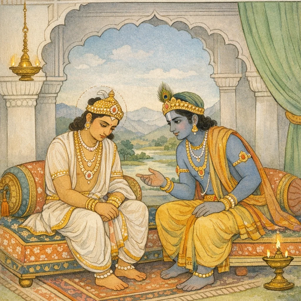 Chapter Arc: राजसूय-यज्ञ का स्वप्न सामने है, पर उसके द्वार पर जरासंध का अडिग पर्वत खड़ा है। युधिष्ठिर का मन उत्साहहीन होकर संन्यास की ओर झुकता है—और सभा में एक क्षण को विजय का संकल्प डगमगा जाता है। → युधिष्ठिर अपने प्रियतम सहारों—भीम और अर्जुन को ‘दो नेत्र’ और कृष्ण को ‘मन’ कहकर भी स्वीकारते हैं कि जरासंध की सेना और पराक्रम यम के समान दुर्जेय हैं। वे कहते हैं कि राजसूय ‘दुराहर’ है; आरम्भ करने पर भी विफलता का भय है, और न करने पर भी अयोग्यता का कलंक। → कृष्ण क्षत्रिय-धर्म का कठोर प्रकाश सभा में रखते हैं: शत्रु-विजय ही क्षत्रिय की वृत्ति है; दैन्य और मोह—ये दोनों विनाशक दोष हैं जिन्हें जय चाहने वाले राजा को त्यागना चाहिए। वे बताते हैं कि प्रमाद-रूप छिद्र से बलवान शत्रु भी क्षीण होता है—अर्थात् जरासंध भी अजेय नहीं, अवसर और नीति से जीता जा सकता है। → कृष्ण लक्ष्य को धर्म-रक्षा से जोड़ते हैं: राजसूय की सिद्धि के लिए जरासंध-विनाश और बंदी राजाओं का परिरक्षण—यह यज्ञार्थ कर्म भी है और लोक-रक्षा भी। वे युधिष्ठिर को संन्यास-प्रवृत्ति से हटाकर आरम्भ, पुरुषार्थ और नीति-युक्त अभियान की ओर मोड़ते हैं। → युधिष्ठिर का संकल्प पुनः जागता है—अब प्रश्न यह रह जाता है कि जरासंध तक पहुँचने और उसे गिराने का ‘द्वार’ कौन-सा होगा, और कौन-से वीर इस कार्य के लिए अग्रसर होंगे।