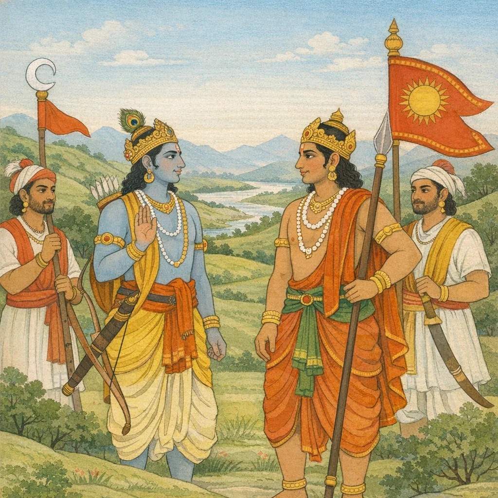 Chapter Arc: Janamejaya’s hunger for ancestral glory flares again—he urges the sage to narrate the digvijaya in full, for his satisfaction is not yet quenched. → Vaishampayana turns the lens to Dhananjaya (Arjuna): with measured force he brings regions like Kulinda under sway, then meets a sterner test in the eastern king Bhagadatta, whose resistance stretches into an eight-day contest. → After eight days of battle, Bhagadatta—still unwearied—addresses Arjuna with admiration, naming him Indra’s son and acknowledging that such prowess befits him; the duel’s heat turns into a moment of recognition and choice. → Arjuna declares his purpose: not personal enmity, but Yudhishthira’s rajasuya—he asks Bhagadatta to give tribute and accept the dharmic overlordship of the truthful, sacrificial king. Bhagadatta consents, equating Arjuna and Yudhishthira in his regard and promising to do what is asked. → The digvijaya continues beyond Bhagadatta’s submission—new lands and kings await Arjuna’s approach.