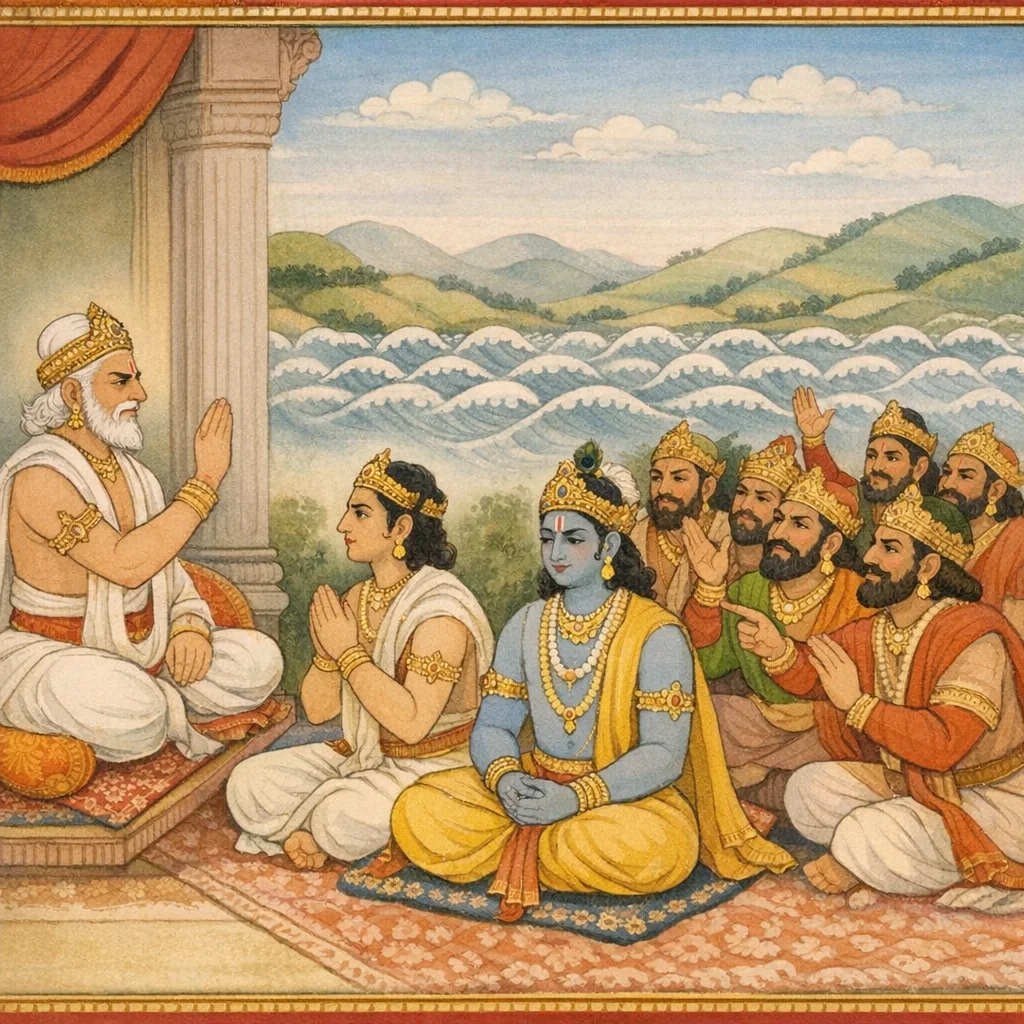 Chapter Arc: शिशुपाल-वध के बाद सभा में राजाओं का “महान् नृपतिसागर” रोष से उफन पड़ता है; युधिष्ठिर उस चंचल क्रोध-समुद्र को देखकर भीष्म से मार्ग पूछते हैं। → युधिष्ठिर कहते हैं—“पितामह! ऐसा उपाय बताइए कि यज्ञ में विघ्न न पड़े, प्रजा का हित हो, और यह सभा सर्वत्र शान्त हो।” भीष्म स्थिति की जड़ बताते हैं: कृष्ण के प्रति अज्ञानजन्य उन्माद, और शिशुपाल के भीतर स्थित तेज का रहस्य। → भीष्म का निर्णायक कथन—कृष्ण ‘सुप्त सिंह’ नहीं, जगत् के प्रभव और निधन हैं; लोग उन्हें न समझकर कुत्तों की तरह सिंह के निकट भौंक रहे हैं, और शिशुपाल का तेज स्वयं भगवान् में लीन होने को था। → भीष्म की रूक्ष परन्तु हितकारी वाणी से युधिष्ठिर को धर्मसम्मत दिशा मिलती है: यज्ञ-शान्ति का आधार कृष्ण-तत्त्व की स्वीकृति और सभा का संयम है, न कि प्रतिशोध या पक्षपात। → चेदिराज (शिशुपाल-पक्ष) भीष्म के कठोर शब्द सुनकर भीतर-ही-भीतर खौल उठता है—सभा की शान्ति टिकेगी या नया विरोध भड़केगा?