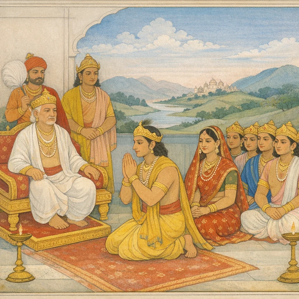 Chapter Arc: द्यूत-अपमान और द्रौपदी-पराभव के बाद सभा में एक अप्रत्याशित मोड़ आता है—धृतराष्ट्र, वृद्ध और अंधे होते हुए भी, युधिष्ठिर को ‘सहधन’ लौटाकर कुशल-क्षेम के साथ विदा करने का आदेश देते हैं। → धृतराष्ट्र का उपदेश केवल औपचारिक नहीं रहता; वह युधिष्ठिर को कटुवचन न रखने, आर्य-मर्यादा न तोड़ने, और दुर्योधन के पारुष्य को हृदय में न बसाने की सीख देता है—पर भीतर-भीतर यह भय भी धड़कता है कि यह शांति क्षणिक है और दुर्योधन की विष-वृत्ति फिर सिर उठाएगी। → धृतराष्ट्र का निर्णायक वचन—‘अनुज्ञाता: सहधना: स्वराज्यमनुशासत’—युधिष्ठिर को धन सहित अपने राज्य का शासन करने और इन्द्रप्रस्थ लौटने की आज्ञा; साथ ही दुर्योधन के कठोर व्यवहार को क्षमा कर देने का आग्रह। → युधिष्ठिर, भ्राताओं और द्रौपदी सहित, मेघ-निनाद करते रथों पर प्रसन्न-मन से इन्द्रप्रस्थ की ओर प्रस्थान करते हैं; सभा का तत्कालिक संकट शांत होता दिखता है। → यह विदाई उपदेश की शांति में लिपटी हुई है, पर दुर्योधन के अपमान और अधर्म की स्मृति भविष्य के संघर्ष का बीज छोड़ जाती है।