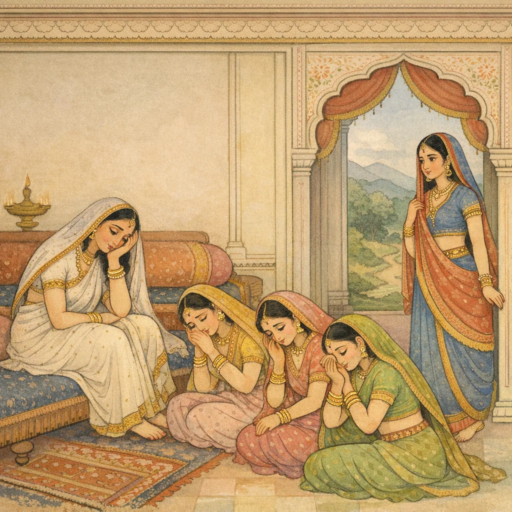 Chapter Arc: द्रौपदी और कुन्ती विदा लेने को उठती हैं ही कि पाण्डवों के अन्तःपुर में एकाएक महान् निनाद उठता है—वन-प्रस्थान का क्षण घर-घर में शोक की लहर बनकर टूट पड़ता है। → कुन्ती अपने भाग्य-दोष को कारण मानकर आत्मग्लानि में डूबती है—‘उत्तम गुणों से युक्त पुत्रों को मैंने दुःख के लिए ही जन्म दिया।’ नगर की स्त्रियाँ कुरुओं को धिक्कारती हुई रोती हैं; धर्म, यश, वीर्य से सम्पन्न पुत्रों पर ‘दया करो’ की पुकार उठती है। → कुन्ती का विलाप चरम पर पहुँचता है—जीवन-धारण का धर्म अनित्य है, फिर भी विधाता ने मेरे जीवन का शीघ्र अन्त क्यों नहीं किया?—यह प्रश्न करुणा को तीव्रतम बना देता है और समूचे नगर का शोक एक स्वर हो जाता है। → विलाप और धिक्कार के बीच विदाई का अनिवार्य कर्म सम्पन्न होता है; पाण्डव-गृहस्थी का सुख-आश्रय टूटकर वन-मार्ग की कठोरता में बदलने लगता है। → इसी शोक-छाया में विदुर धृतराष्ट्र के महल पहुँचते हैं; उद्विग्न धृतराष्ट्र उनसे प्रश्न करते हैं—आगे राजसभा में क्या निर्णय/प्रतिक्रिया होगी, यह अगले प्रसंग पर टिका रह जाता है।