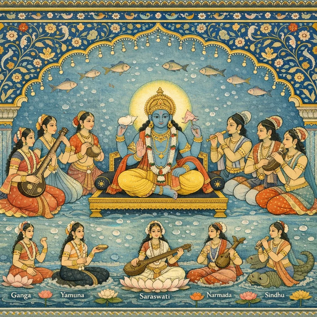 In that hall, Varuṇa himself is seated, accompanied by Vāruṇī. He is clad in celestial garments set with radiant jewels and adorned with divine ornaments—an image of sovereign splendor and ordered majesty.