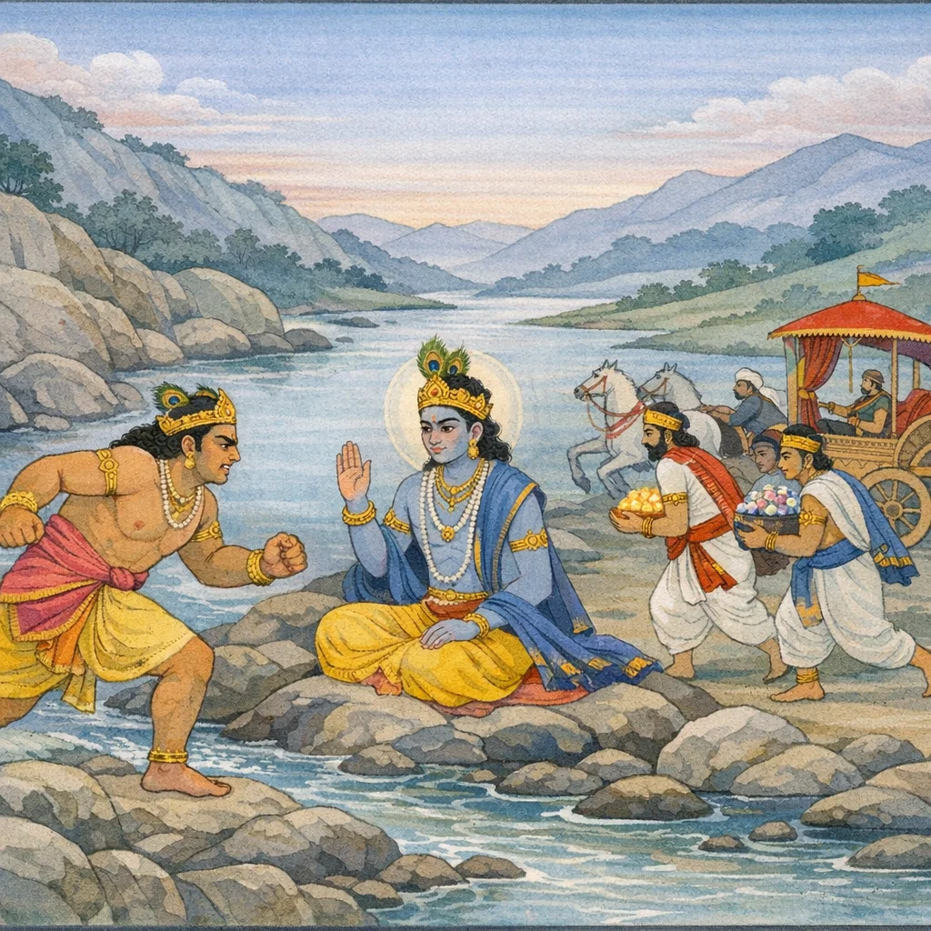 “O Brāhmaṇa! He who among men is ever held to be the highest standard of authority—bearer of the Gāṇḍīva bow and the white horses, whose banner bears the foremost of monkeys; he who, in a bound combat, dared to confront Śaṅkara himself—Śiva of the blue throat, Umā’s lord—and yet pleased him; he than whom none is dearer to me upon this earth, and for whose sake there is nothing—wife and sons included—that I would not give; even my beloved friend Arjuna, Kuntī’s son, doer of great deeds without strain, never before spoke such words as you speak to me today. And having completed a great and dreadful observance of brahmacarya for twelve years, dwelling upon the flank of the Himālaya, I obtained through my tapas him of whom this is spoken.”